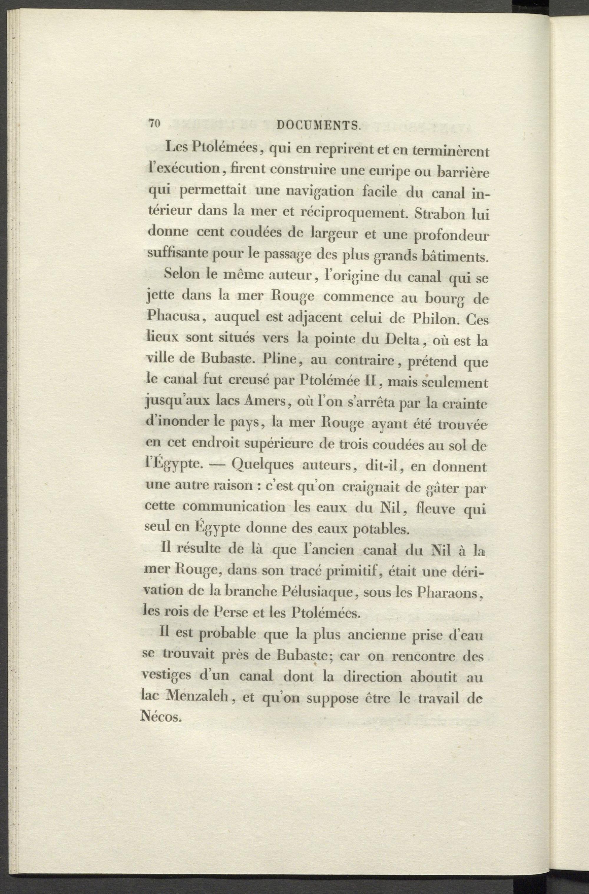 Selon le même auteur, l’origine du canal qui se jette dans la mer Rouge commence au bourg de Pliacusa, auquel est adjacent celui de Pbilon. Ces lieux sont situés vers la pointe du Delta, où est la ville de Bubaste. Pline, au contraire, prétend que le canal fut creusé par Ptolémée II, mais seulement jusqu’aux lacs Amers, où l’on s’arrêta par la crainte d’inonder le pays, la mer Rouge ayant été trouvée en cet endroit supérieure de trois coudées au sol de l’Egypte. — Quelques auteurs, dit-il, en donnent: une autre raison : c’est qu’on craignait de gâter par cette communication les eaux du Nil, fleuve qui seul en Egypte donne des eaux potables.