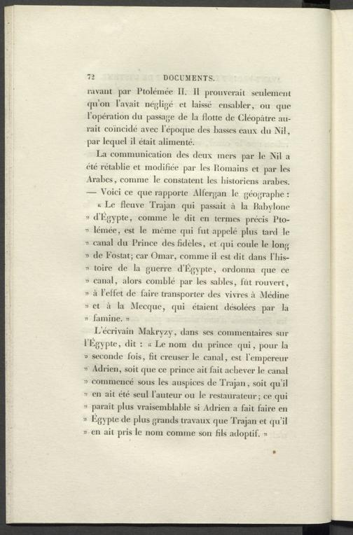 L’écrivain Makryzy, dans ses commentaires sur l’Egypte, dit : « Le nom du prince qui, pour la « seconde fois, fit creuser le canal, est l’empereur » Adrien, soit que ce prince ait fait achever le canal ii commencé sous les auspices de Trajan, soit qu’il « en ait été seul l’auteur ou le restaurateur; ce qui n paraît plus vraisemblable si Adrien a fait faire en ” Egypte de plus grands travaux que Trajan et qu’il » en ait pris le nom comme son fils adoptif. «