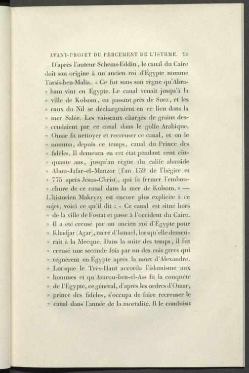 AVANT-PROJET DD PERCEMENT DE L'ISTHME. O D’après 1’autenr Schcms-Eddin, le canal du Caire doit son origine à un ancien roi d’Egypte nommé Tarsis-ben-Malia. « Ce fut sous son règne qu’Abra- » bam vint en Egypte. Le canal venait jusqu’à la » ville de Kolsom, en passant près de Suez, et les » eaux du jNil se déchargeaient en ce lieu dans la mer Salée. Les vaisseaux chargés de grains des- » rendaient par ce canal dans le golfe Arabique. » Omar fit nettoyer et recreuser ce canal, et on le ;> nomma, depuis ce temps, canal du Prince des « fidèles. 11 demeura en cet état pendant cent cin- » qualité ans, jusqu’au règne du calife abasside :> Abou-Jafar-el-Manzor (l’an 159 de l’hégire et » 775 après Jésus-Christ), qui fit fermer l’embou- ■> chure de ce canal dans la mer de Kolsom. « — J . historien Makryzy est encore plus explicite à ce sujet; voici ce qu’il dit : « Ce canal est situé hors 'i de la ville de Foslat et passe à l’occident du Caire. « Il a été creusé par un ancien roi d’Egypte pour » K hadjar (Agar), mère d’Ismael, lorsqu'elle demeu- » rait à la Mecque. Dans la suite des temps, il fut » creusé une seconde fois par un des rois grecs qui » régnèrent en Egypte après la mort d’Alexandre. » Lorsque le Très-Haut accorda l’islamisme aux « hommes et qu’Amrou-bcn-el-Ass fit la conquête « de l’Egypte, ce général, d’après les ordres d’Omar, » prince des fidèles, s’occupa de faire recreuser le « canal dans l’année de la mortalité. Il le conduisit