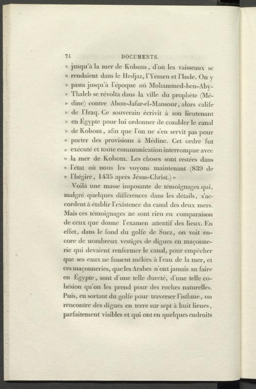 » jusqu’à la merde Kolsom, d’où les vaisseaux se » rendaient dans le Hedjaz, l’Yémen et l’Inde. On y » passa jusqu’à l’époque où Mobammed-bcn-Aby- « Thaleb se révolta dans la ville du prophète (Mé- » dine) contre Abou-Jafar-el-Mansour, alors calife » de l’Iraq. Ce souverain écrivit à son lieutenant » en Egypte pour lui ordonner de combler le canal « de Kolsom, afin que l’on ne s’en servît pas pour » porter des provisions à Médine. Cet ordre fut » exécuté et toute communication interrompue avec » la mer de Kolsom. Les choses sont restées dans « l’état où nous les voyons maintenant (839 de )’ l’hégire, 1435 après Jésus-Christ.) «