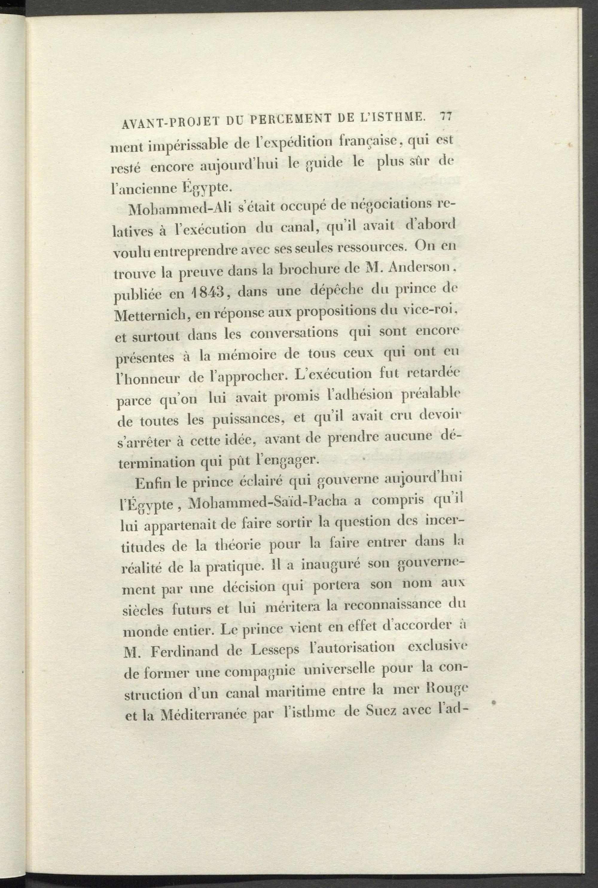 Mohammed-Ali s’était occupé de négociations relatives à l’exécution du canal, qu’il avait d’abord voulu entreprendre avec ses seules ressources. On en trouve la preuve dans la brochure de M. Anderson, publiée en 1843, dans une dépêche du prince de Metternich, en réponse aux propositions du vice-roi. et surtout dans les conversations qui sont encore présentes à la mémoire de tous ceux qui out eu l'honneur de l’approcher. L’exécution fut retardée parce qu’on lui avait promis l’adhésion préalable de toutes les puissances, et qu’il avait cru devoir s’arrêter à cette idée, avant de prendre aucune détermination qui pût l’engager.
