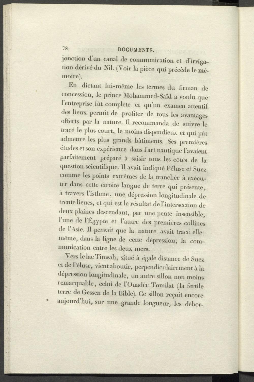 En dictant lui-même les termes du firman de concession, le prince Mobammed-Saïd a voulu que l’entreprise fût complète et qu’un examen attentif des lieux permît de profiter de tous les avantages offerts par la nature. Il recommanda de suivre le tracé le plus court, le moins dispendieux et qui pût admettre les plus grands bâtiments. Ses premières études et son expérience dans l’art nautique l’avaient parfaitement préparé à saisir tous les côtés de la question scientifique. Il avait indiqué Péluse et Suez comme les points extrêmes de la trancliée à exécuter dans cette étroite langue de terre qui présente, à travers l’isthme, une dépression longitudinale de trente lieues, et qui est le résultat de l’intersection de deux plaines descendant, par une pente insensible, l’une de l’Egypte et l’autre des premières collines de l’Asie. 11 pensait que la nature avait tracé elle- même, dans la ligne de cette dépression, la communication entre les deux mers.