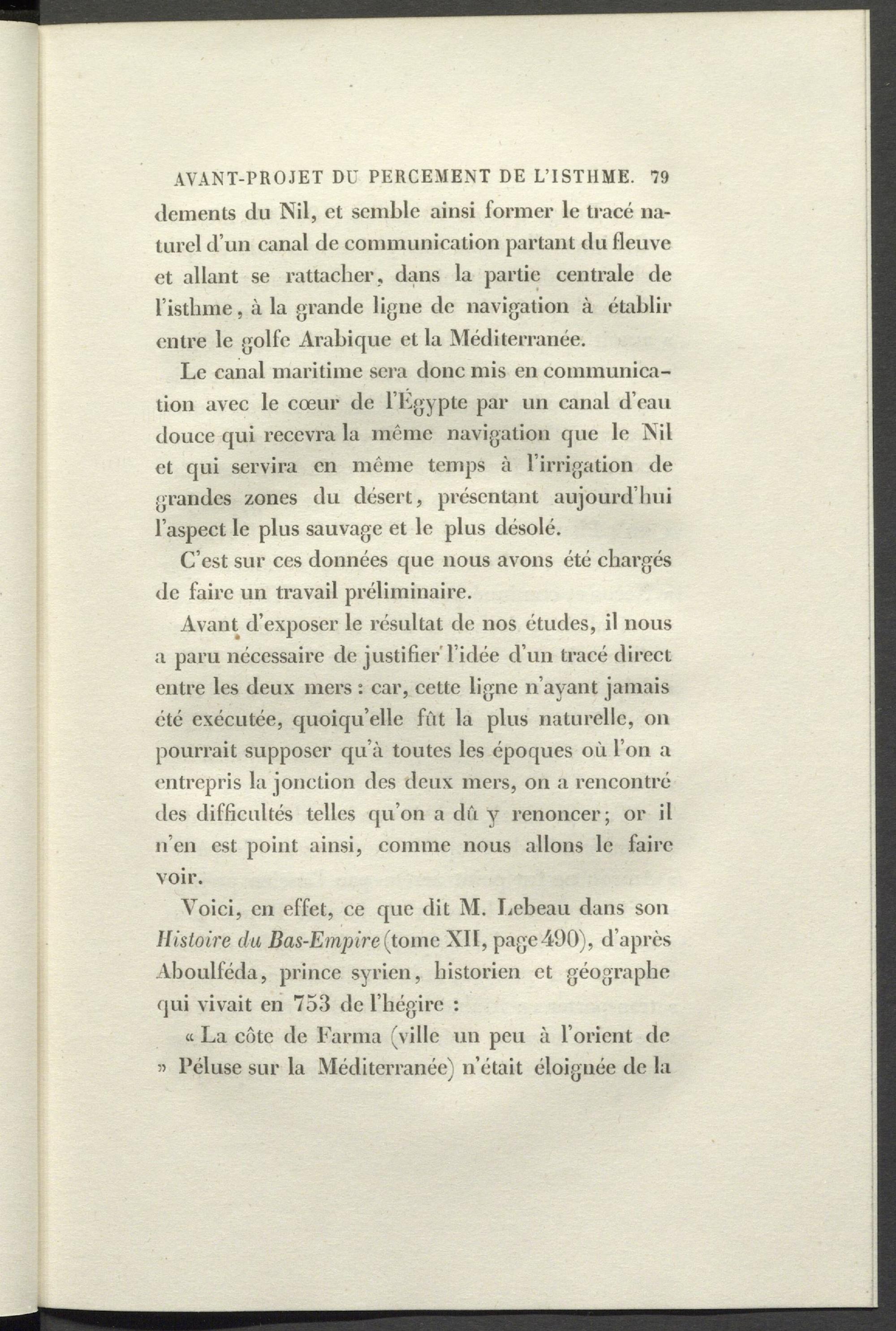 AVANT-PROJET DU PERCEMENT DE L’ISTIIME. 79 «lements du Nil, et semble ainsi former le tracé naturel d’un canal de communication partant du fleuve et allant se rattacher, dans la partie centrale de l’isthme, à la grande ligne de navigation à établir entre le golfe Arabique et la Méditerranée.