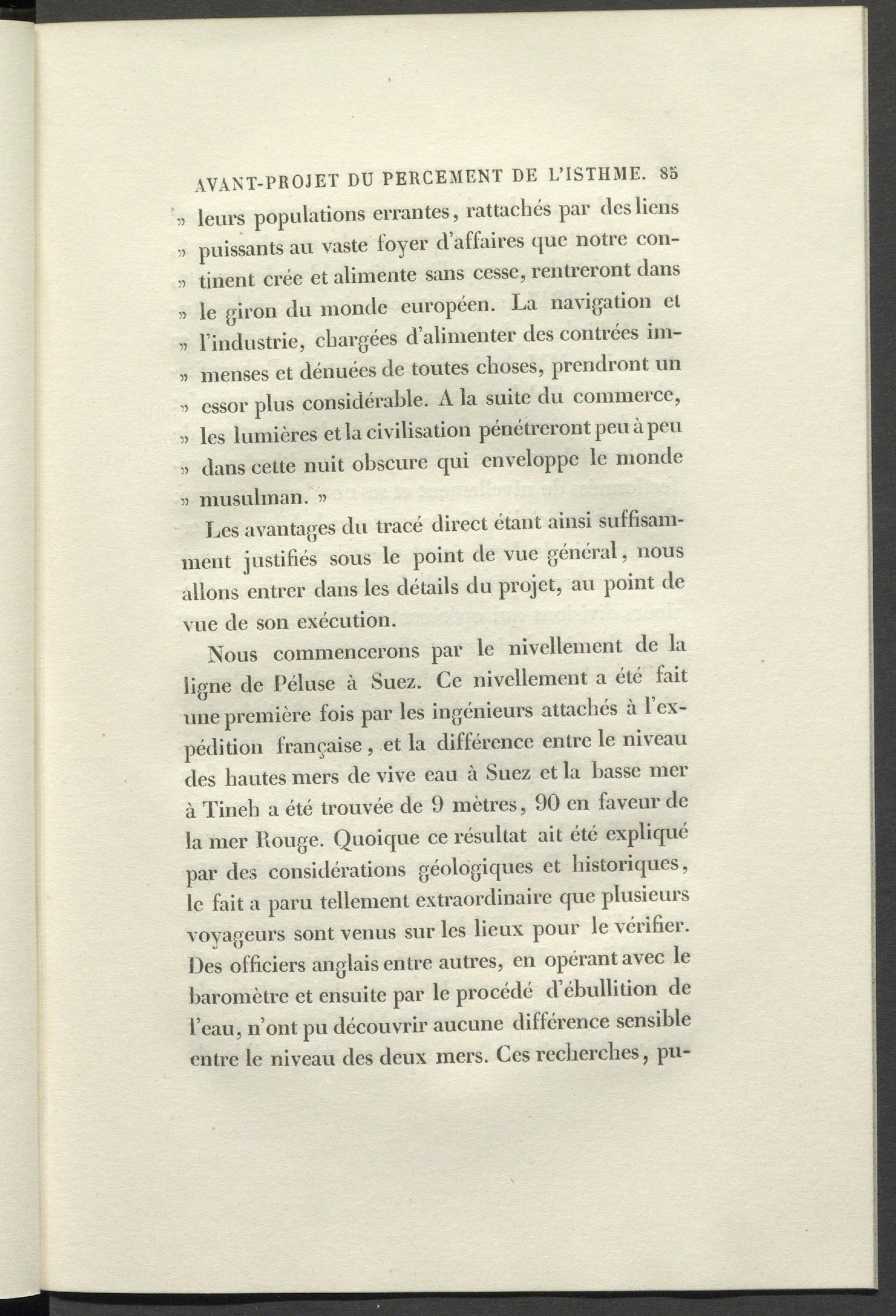 Nous commencerons par le nivellement de la ligne de Péluse à Suez. Ce nivellement a été fait une première fois par les ingénieurs attachés à {’expédition française, et la différence entre le niveau des hautes mers de vive eau à Suez et la basse mer à Tineb a été trouvée de 9 mètres, 90 en faveur de la mer Rouge. Quoique ce résultat ait été expliqué par des considérations géologiques et historiques, le fait a paru tellement extraordinaire que plusieurs voyageurs sont venus sur les lieux pour le vérifier. Des officiers anglais entre autres, en opérant avec le baromètre et ensuite par le procédé d’ébullition de l’eau, n’ont pu découvrir aucune différence sensible entre le niveau des deux mers. Ces recherches, pu-