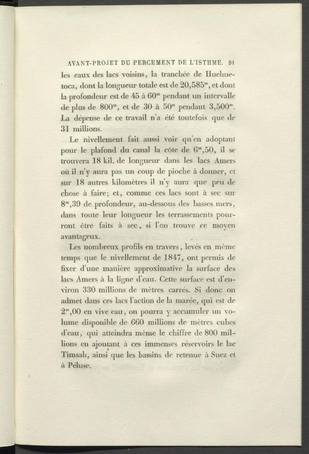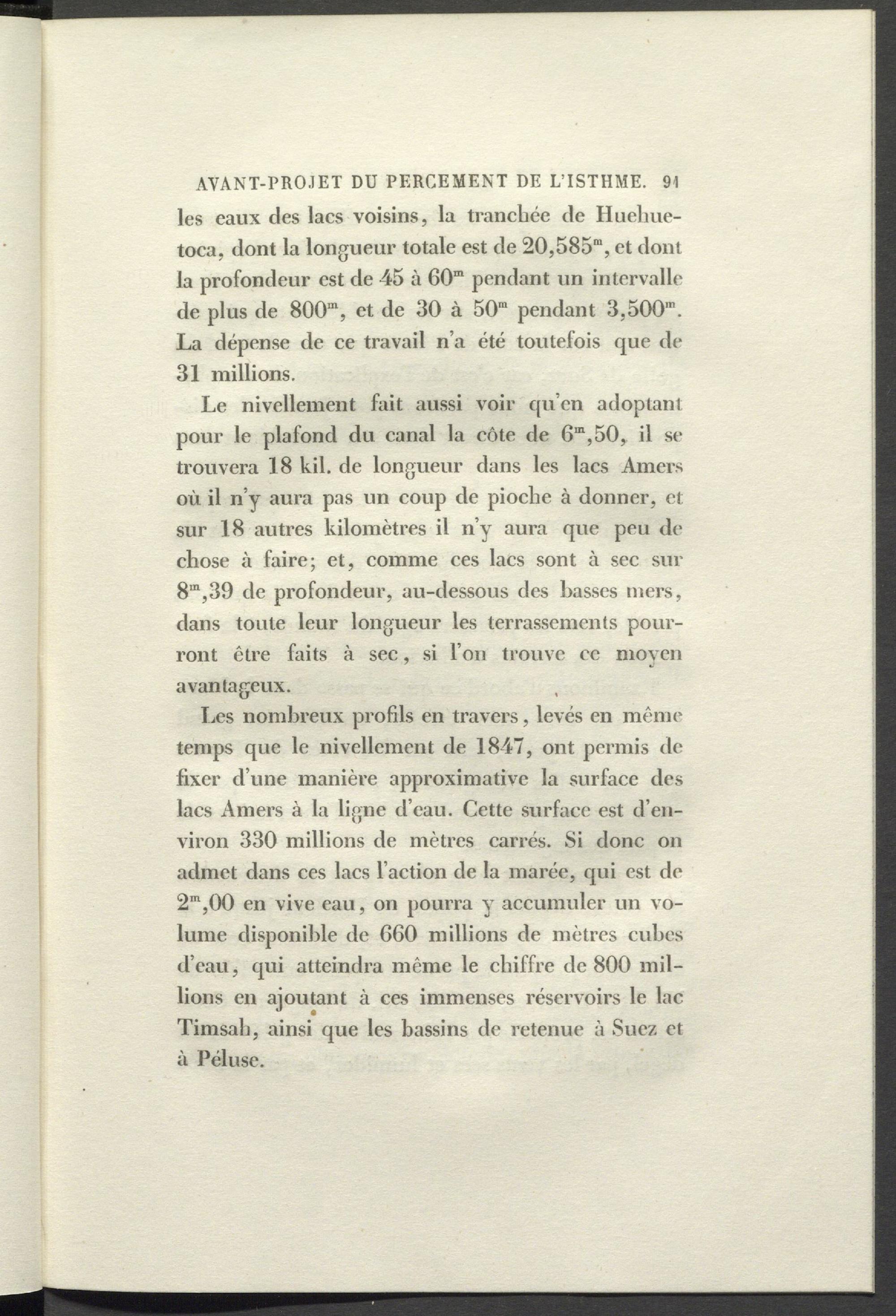 Le nivellement fait aussi voir qu’en adoptant pour le plafond du canal la côte de 6 m ,50, il se trouvera 18 kil. de longueur dans les lacs Amers où il n’y aura pas un coup de pioche à donner, et sur 18 autres kilomètres il n’y aura que peu de chose à faire; et, comme ces lacs sont à sec sur 8”,39 de profondeur, au-dessous des basses mers, dans toute leur longueur les terrassements pourront être faits à sec, si l’on trouve cc moyen avantageux.