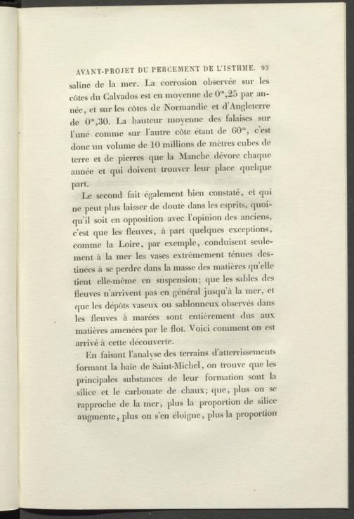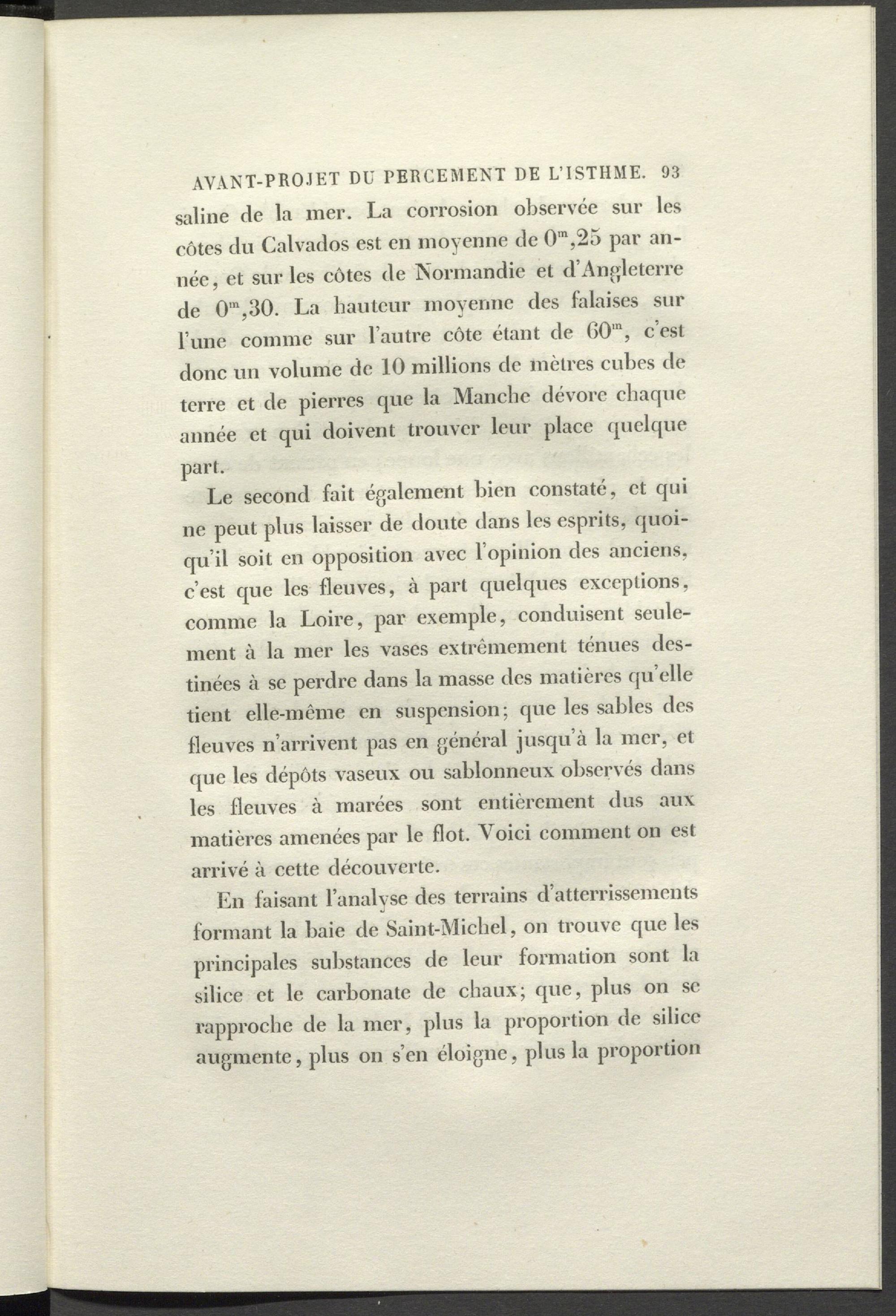 AVANT-PROJET DU PERCEMENT DE L’ISTHME. 93 saline de la mer. La corrosion observée sur les côtes du Calvados est en moyenne de O m ,25 par année , et sur les côtes de Normandie et d’Angleterre de 0 m ,30. La hauteur moyenne des falaises sur l’une comme sur l’autre côte étant de G0' n , c’est donc un volume de 10 millions de mètres cubes de terre et de pierres que la Manche dévore chaque année et qui doivent trouver leur place quelque part.