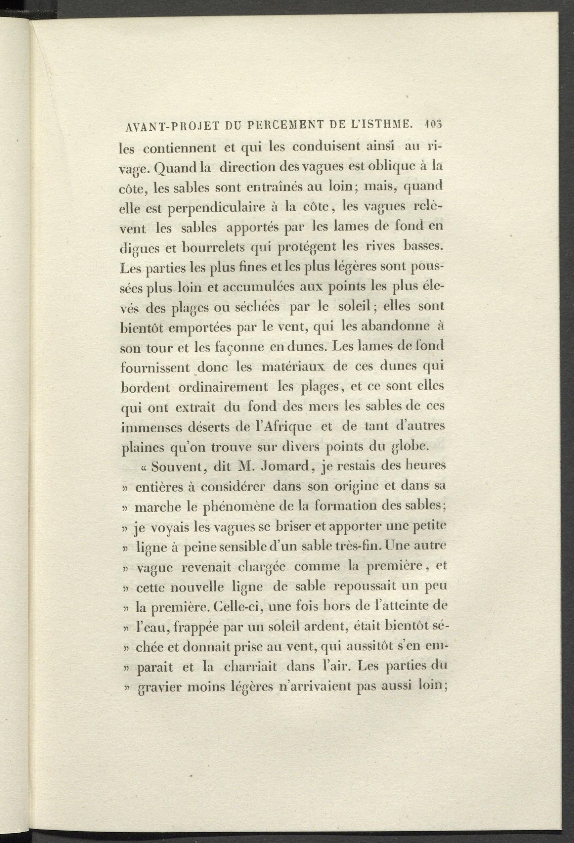 « Souvent, dit M. Jomard, je restais des heures » entières à considérer dans son origine et dans sa » marche le phénomène de la formation des sables; » je voyais les vagues se briser et apporter une petite « ligne à peine sensible d’un sable très-fin. Une autre » vague revenait chargée comme la première, et « cette nouvelle ligne de sable repoussait un peu » la première. Celle-ci, une fois hors de l’atteinte de » l’eau, frappée par un soleil ardent, était bientôt sé- » chée et donnait prise au vent, qui aussitôt s’en em- « parait et la charriait dans l’air. Les parties du « gravier moins légères n’arrivaient pas aussi loin;