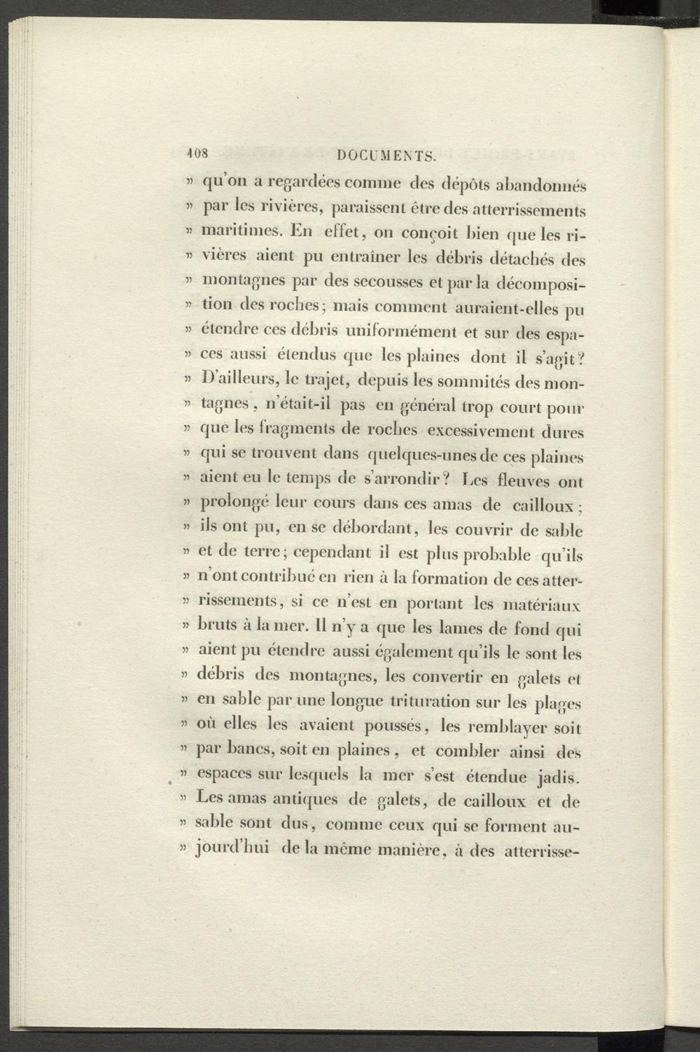 « qu’on a regardées comme des dépôts abandonnés « par les rivières, paraissent être des atterrissements » maritimes. En effet, on conçoit bien que les ri- » vières aient pu entraîner les débris détachés des » montagnes par des secousses et par la décomposi- i) tion des roches; mais comment auraient-elles pu » étendre ces débris uniformément et sur des espa- » ces aussi étendus que les plaines dont il s’agit? » D’ailleurs, le trajet, depuis les sommités des mon- » tagnes , n’était-il pas en général trop court pour r> que les fragments de roches excessivement dures « qui se trouvent dans quelques-unes de ces plaines » aient eu le temps de s arrondir ? Les fleuves ont » prolongé leur cours dans ces amas de cailloux ; « ils ont pu, en se débordant, les couvrir de sable « et de terre ; cependant il est plus probable qu’ils » n’ont contribué en rien à la formation de ces atter- « rissements, si ce n’est en portant les matériaux » bruts à la mer. II n’y a que les lames de fond qui » aient pu étendre aussi également qu’ils le sont les « débris des montagnes, les convertir en galets et » en sable par une longue trituration sur les plages « où elles les avaient poussés, les remblayer soit par bancs, soit en plaines , et combler ainsi des » espaces sur lesquels la mer s’est étendue jadis. » Les amas antiques de galets, de cailloux et de « sable sont dus, comme ceux qui se forment au- » jourd’hui de la même manière, à des atterrisse-