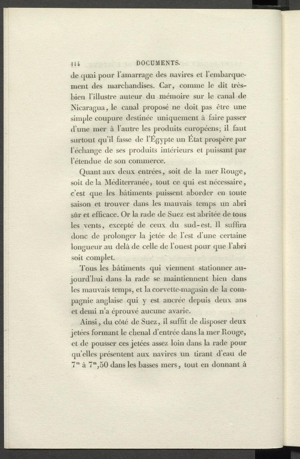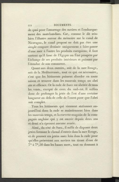 de quai pour l’amarrage des navires et rembarquement des marchandises. Car, comme le dit très- bien l’illustre auteur du mémoire sur le canal de Nicaragua, le canal proposé ne doit pas être une simple coupure destinée uniquement à faire passer d’une mer à l’autre les produits européens; il faut surtout qu’il fasse de l’Égypte un État prospère par l’échange de ses produits intérieurs et puissant par l’étendue de son commerce.