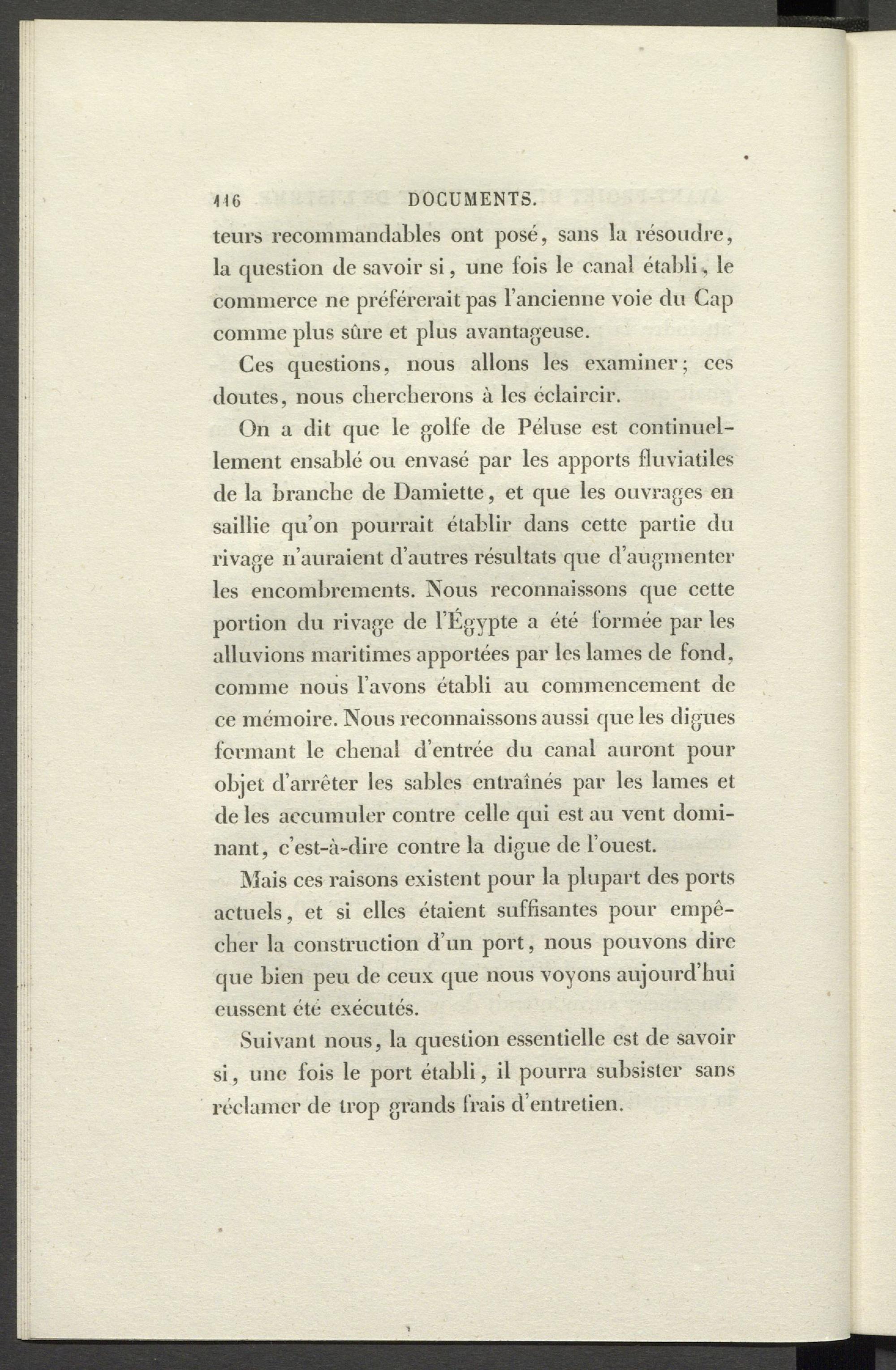 On a dit que le golfe de Péluse est continuellement ensablé ou envasé par les apports fluviatiles de la branche de Damiette, et que les ouvrages en saillie qu’on pourrait établir dans cette partie du rivage n’auraient d’autres résultats que d’augmenter les encombrements. Nous reconnaissons que cette portion du rivage de l’Egypte a été formée par les alluvions maritimes apportées par les lames de fond, comme nous l’avons établi au commencement de ce mémoire. Nous reconnaissons aussi que les digues formant le chenal d’entrée du canal auront pour objet d’arrêter les sables entraînés par les lames et de les accumuler contre celle qui est au vent dominant, c’est-à-dire contre la digue de l’ouest.