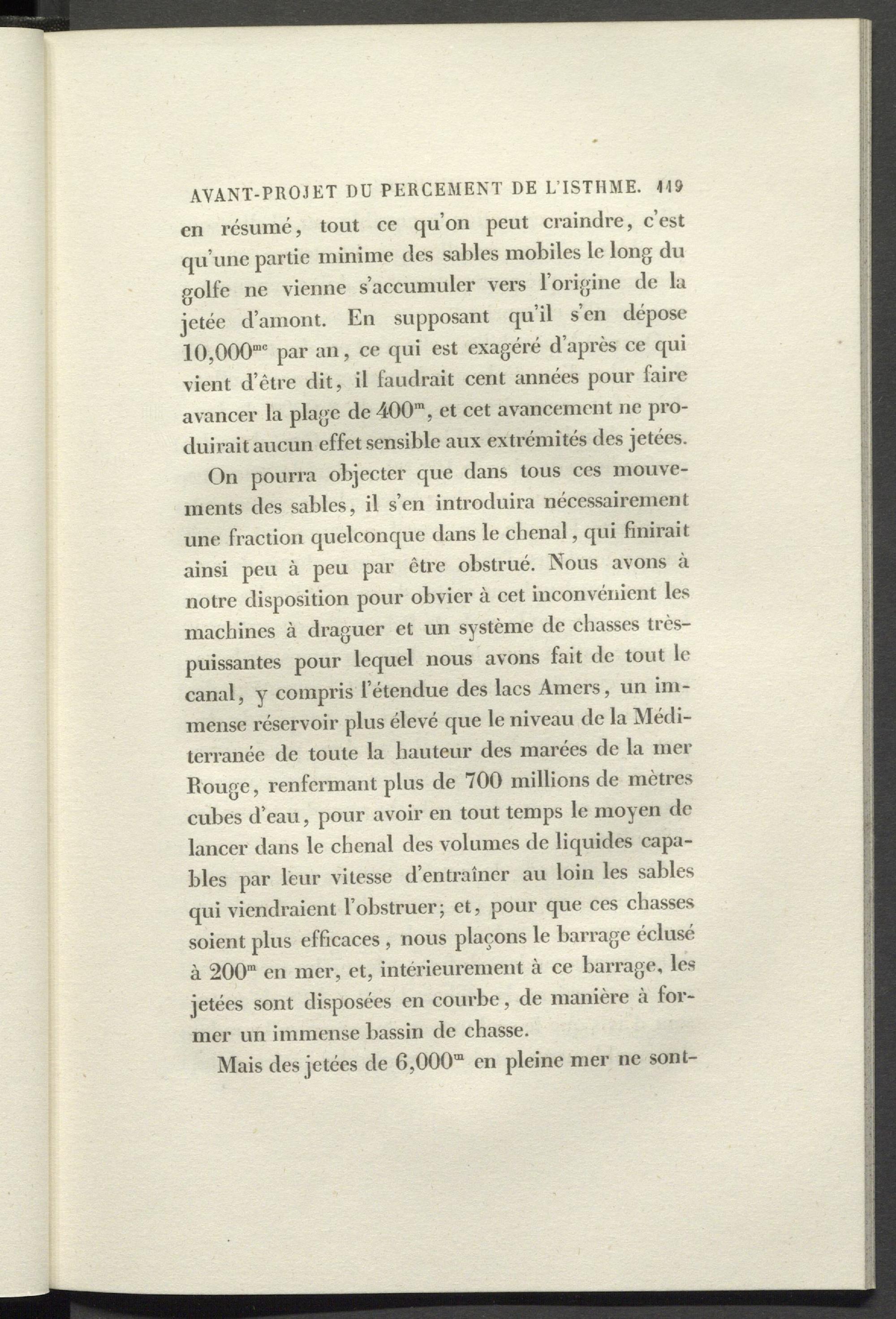 On pourra objecter que dans tous ces mouvements des sables, il s’en introduira nécessairement une fraction quelconque dans le chenal, qui finirait ainsi peu à peu par être obstrué. Nous avons à notre disposition pour obvier à cet inconvénient les machines à draguer et un système de chasses très- puissantes pour lequel nous avons fait de tout le canal, y compris l’étendue des lacs Amers, un immense réservoir plus élevé que le niveau de la Méditerranée de toute la hauteur des marées de la mer Rouge, renfermant plus de 700 millions de mètres cubes d’eau, pour avoir en tout temps le moyen de lancer dans le chenal des volumes de liquides capables par leur vitesse d’entraîner au loin les sables qui viendraient l’obstruer; et, pour que ces chasses soient pins efficaces , nous plaçons le barrage éclusé à 200“ en mer, et, intérieurement à ce barrage, les jetées sont disposées en courbe, de manière à former un immense bassin de chasse.