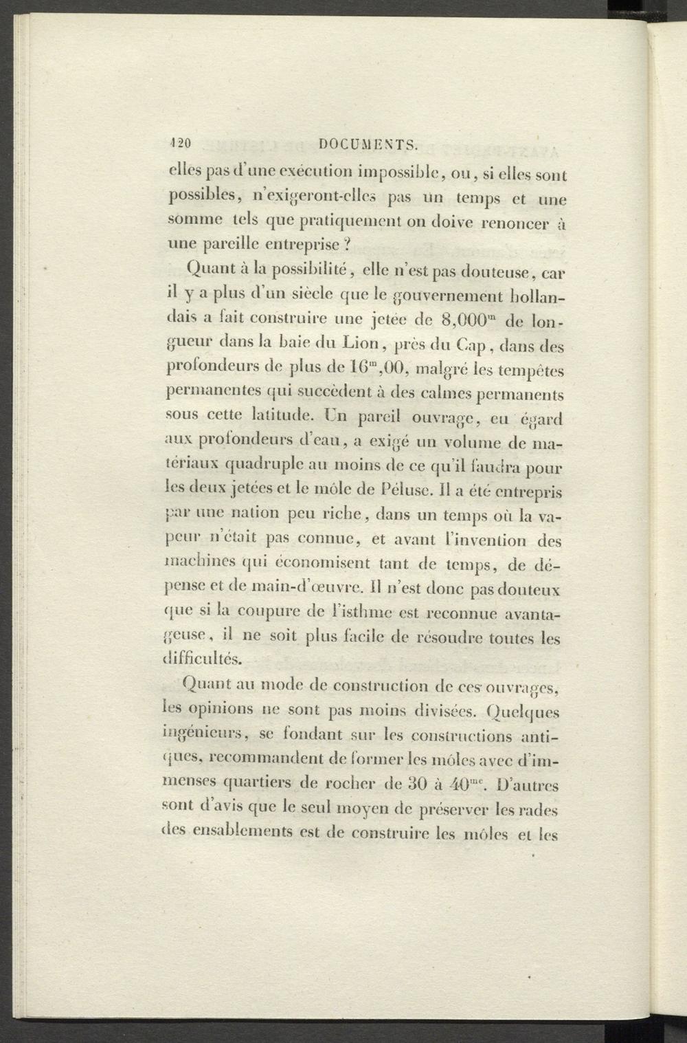 Quant à la possibilité, elle n’est pas douteuse, car il y a plus d’un siècle que le gouvernement hollandais a lait construire une jetee de 8,000'“ de longueur dans la baie du Lion , près du Cap , dans des profondeurs de plus de 1(5“,00, malgré les tempêtes permanentes qui succèdent à des calmes permanents sous cette latitude. Un pareil ouvrage, eu ' égard aux protondeurs d’eau, a exigé un volume de matériaux quadruple au moins de ce qu’il faudra pour les deux jetées et le môle de Péluse. 11 a été entrepris par une nation peu riche, dans un temps où la vapeur n’était pas connue, et avant l’invention des machines qui économisent tant de temps, de dépense et de main-d’œuvre. Il n’est donc pas douteux que si la coupure de l’isthme est reconnue avantageuse , il ne soit plus facile de résoudre toutes les difficultés.