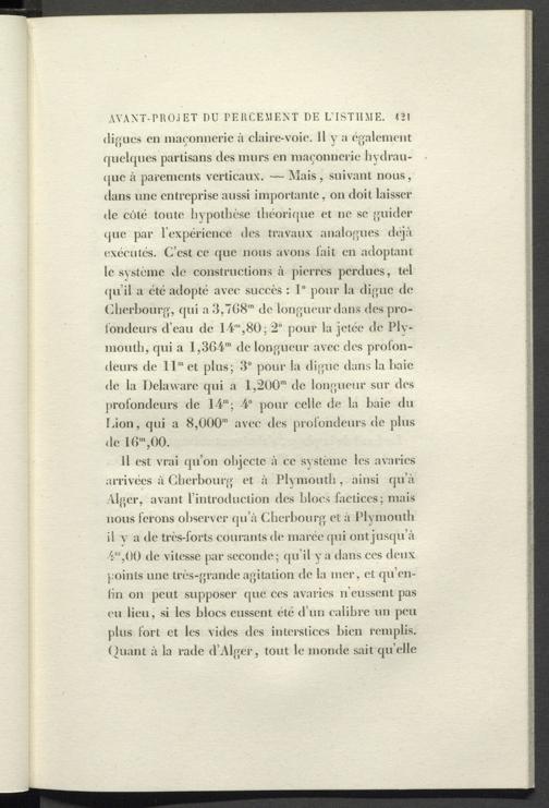 Il est vrai qu’on objecte à ce svstème les avaries arrivées à Cherbourg et à Plymouth , ainsi qu’à Alger, avant l’introduction des blocs factices; mais nous ferons observer qu’à Cherbourg et à Plymouth il v a de très-lorts courants de marée qui ont jusqu’à 4“',(10 de vitesse par seconde; qu’il y a dans ces deux points une très-grande agitation de la mer, et qu’on- lin on peut supposer que ces avaries n’eussent pas eu lieu, si les blocs eussent été d’un calibre un peu plus fort et les vides des interstices bien remplis. Ouant à la rade d’Alger, tout le inonde sait qu elle