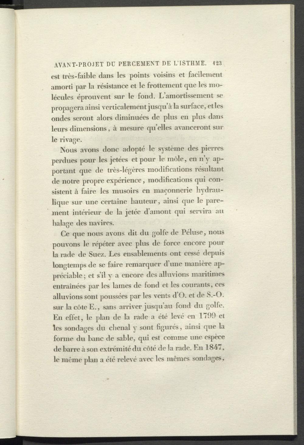 AVANT-PROJET DU PERCEMENT DE L’ISTHME. 123 est très-faible dans les points voisins et facilement amorti par la résistance et le frottement que les molécules éprouvent sur le fond. L’amortissement se propagera ainsi verticalement jusqu’à la surface, etles ondes seront alors diminuées de plus en plus dans leurs dimensions, à mesure qu’elles avanceront sur le rivage.