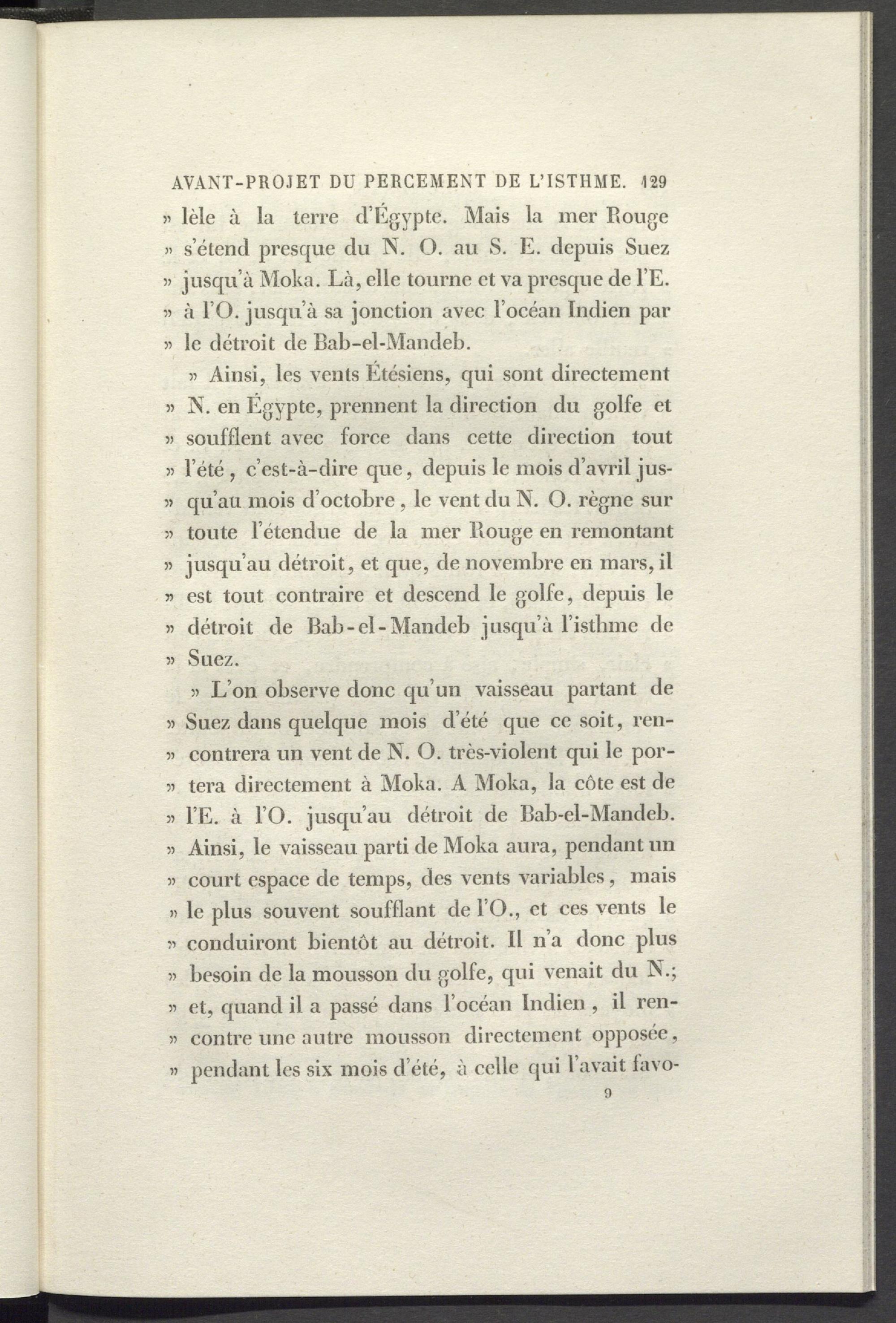 )) L’on observe donc qu’un vaisseau partant de » Suez dans quelque mois d’été que ce soit, ren- 33 contrera un vent de N. O. très-violent qui le por- 33 tera directement à Moka. A Moka, la côte est de 33 l’E. à 10 . jusqu’au détroit de Bab-el-Mandeb. 33 Ainsi, le vaisseau parti de Moka aura, pendant un 33 court espace de temps, des vents variables, mais 33 le plus souvent soufflant de 10., et ces vents le 33 conduiront bientôt au détroit. Il n’a donc plus 33 besoin de la mousson du golfe, qui venait du N.; 3’ et, quand il a passé dans l’océan Indien , il ren- 33 contre une autre mousson directement opposée, 33 pendant les six mois d’été, à celle qui l’avait lavo-