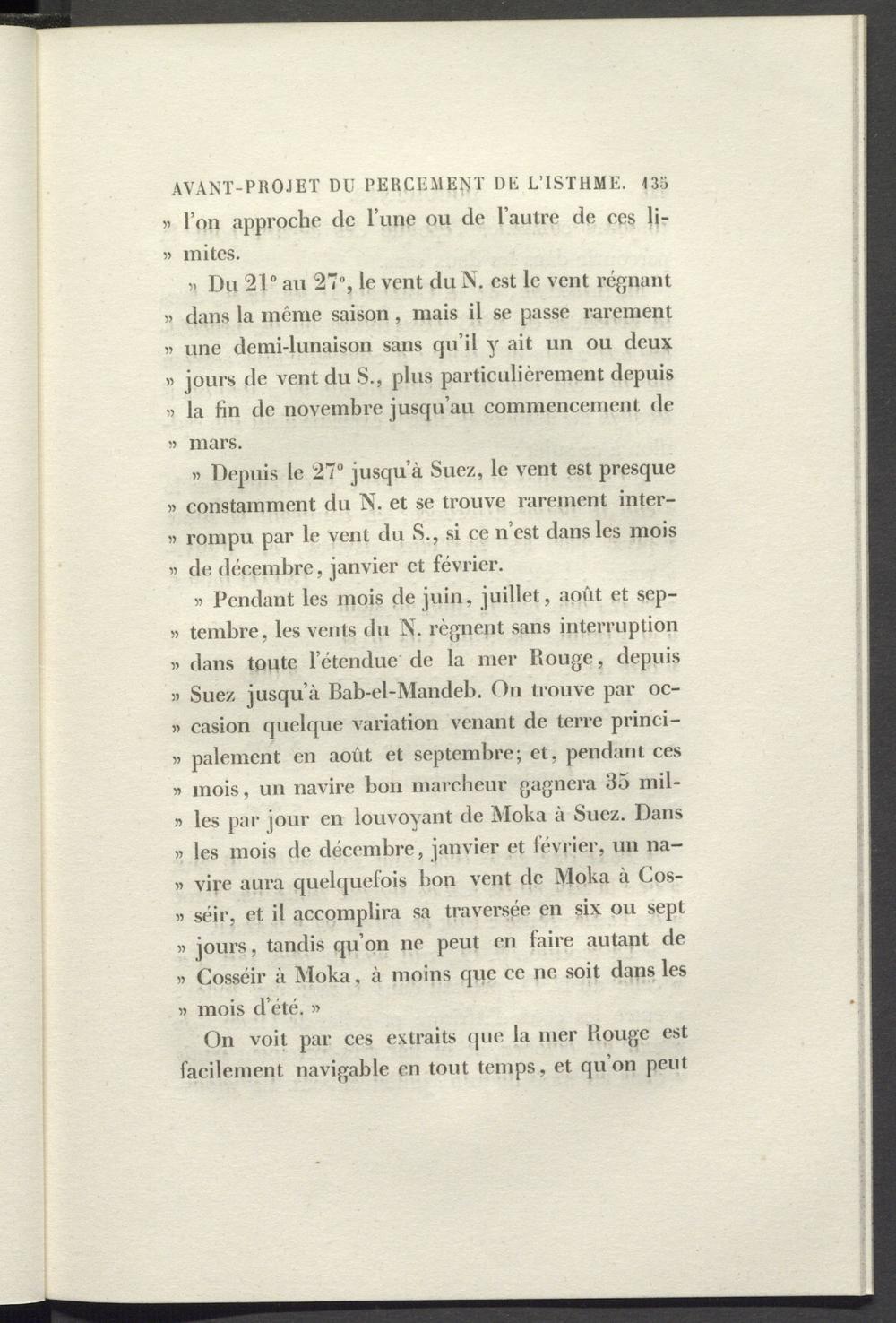 55 Pendant les mois de juin, juillet, aoiTt et sep- 55 tembre, les vents du N. régnent sans interruption 55 dans toute l’étendue de la mer Rouge, depuis 55 Suez jusqu’à Bab-el-Mandeb. On trouve par oc- 55 casion quelque variation venant de terre princi- 55 paiement en août et septembre; et, pendant ces 55 mois, un navire bon marcheur gagnera 35 mil- » les par jour en louvoyant de Moka à Suez. Dans 55 les mois de décembre, janvier et lévrier, un na- 55 vire aura quelquefois bon vent de Moka à Cos- 55 séir, et il accomplira sa traversée en six ou sept 55 jours, tandis qu’on ne peut en faire autant de 55 Cosséir à Moka, à moins que ce ne soit dans les 55 mois d’été. 55