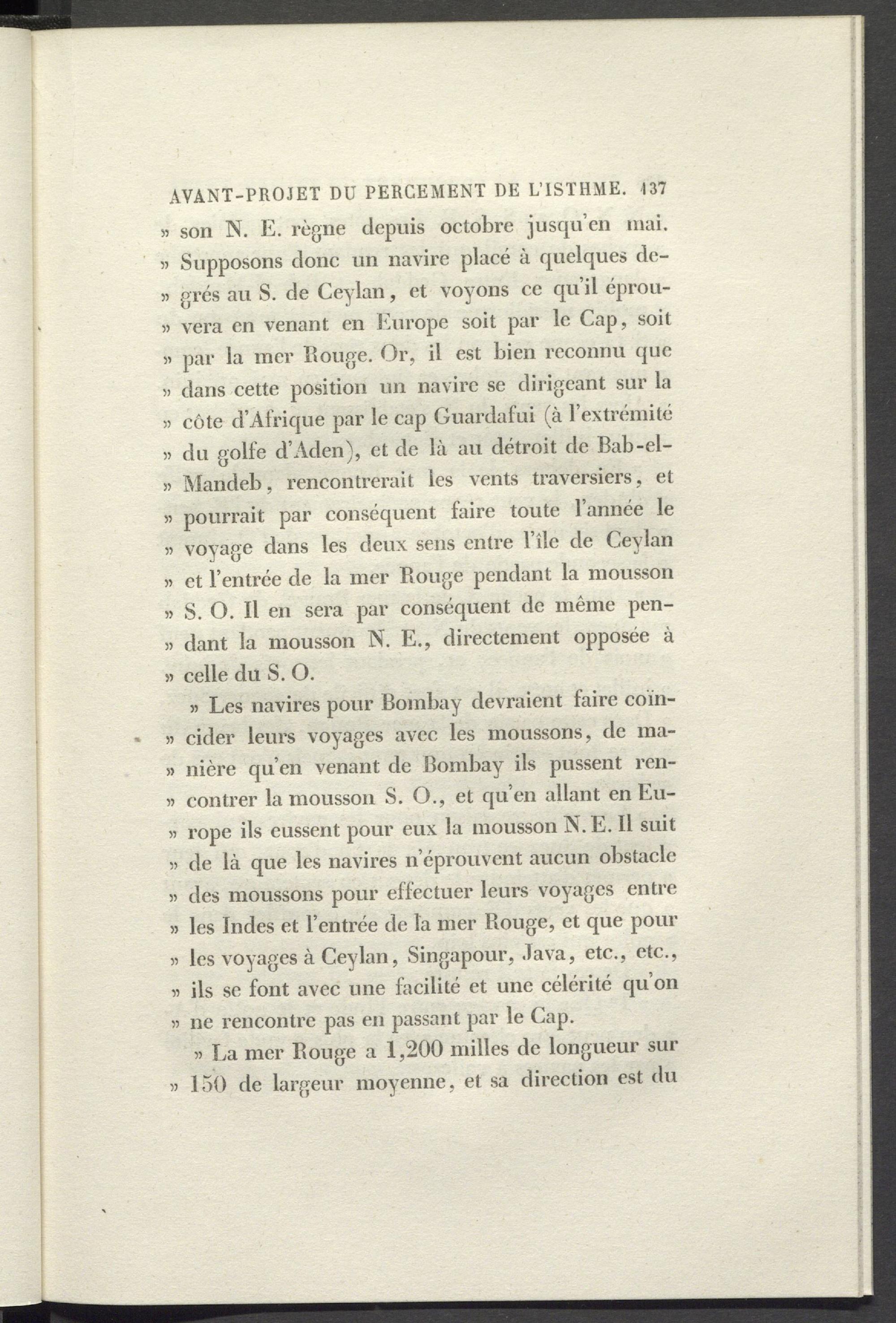 » Les navires pour Bombay devraient faire coïn- » cider leurs voyages avec les moussons, de ma- » nière qu’en venant de Bombay ils pussent rcn- » contrer la mousson S. O., et qu’en allant en Eu- « rope ils eussent pour eux la mousson N. E. Il suit » de là que les navires n’éprouvent aucun obstacle » des moussons pour effectuer leurs voyages entre » les Indes et l’entrée de la mer Rouge, et que pour » les voyages à Ceylan, Singapour, Java, etc., etc., « ils se font avec une facilité et une célérité qu’on « ne rencontre pas en passant par le Cap.