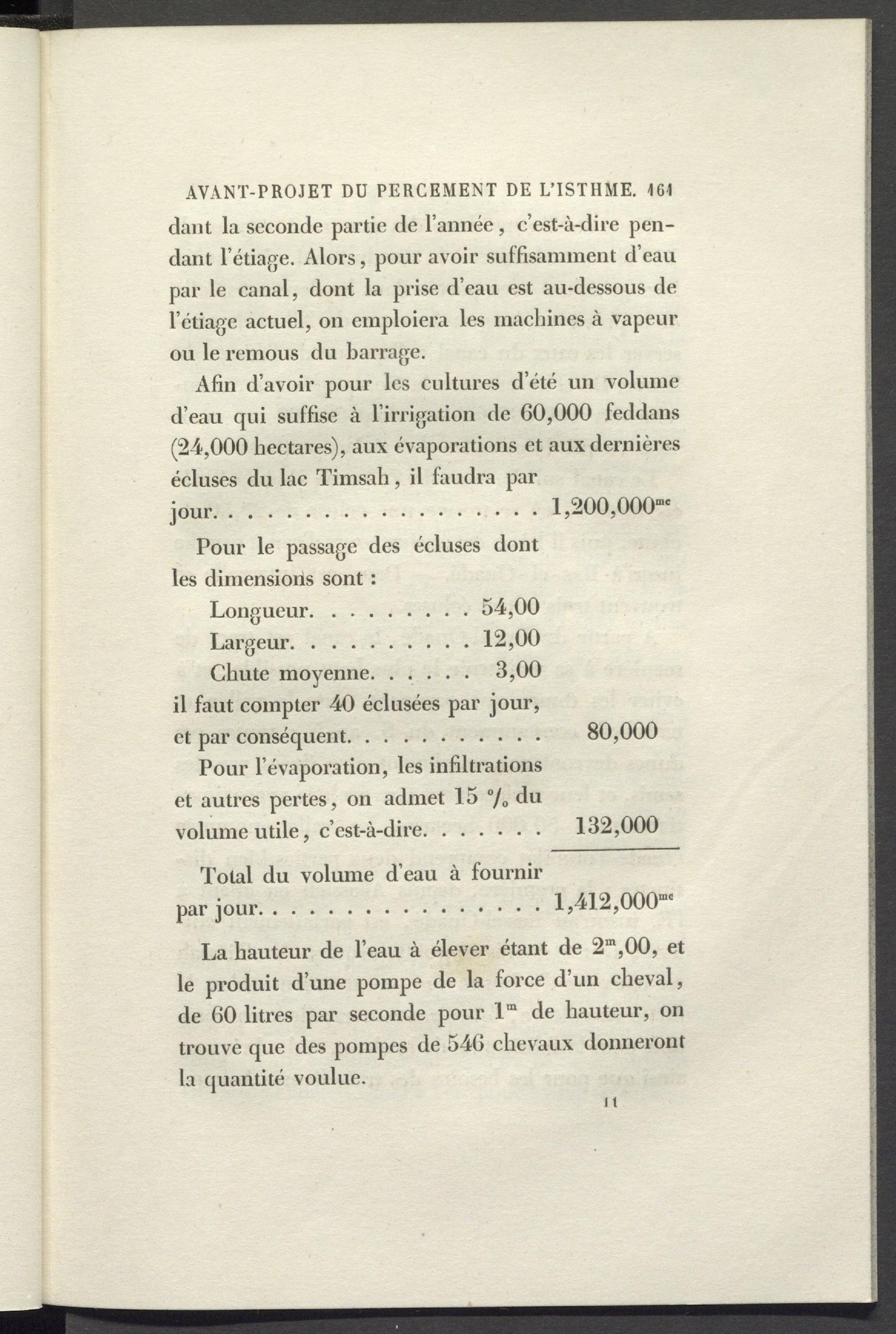 La hauteur de l’eau à élever étant de 2 m ,00, et le produit d’une pompe de la force d’un cheval, de 60 litres par seconde pour l m de hauteur, on trouve que des pompes de 546 chevaux donneront la quantité voulue.