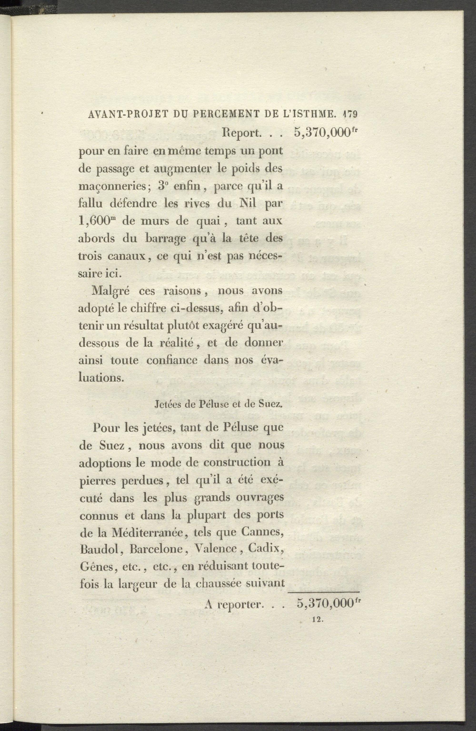 Pour les jetées, tant de Péluse que de Suez , nous avons dit que nous adoptions le mode de construction à pierres perdues, tel qu’il a été exécuté dans les plus grands ouvrages connus et dans la plupart des ports de la Méditerranée, tels que Cannes,