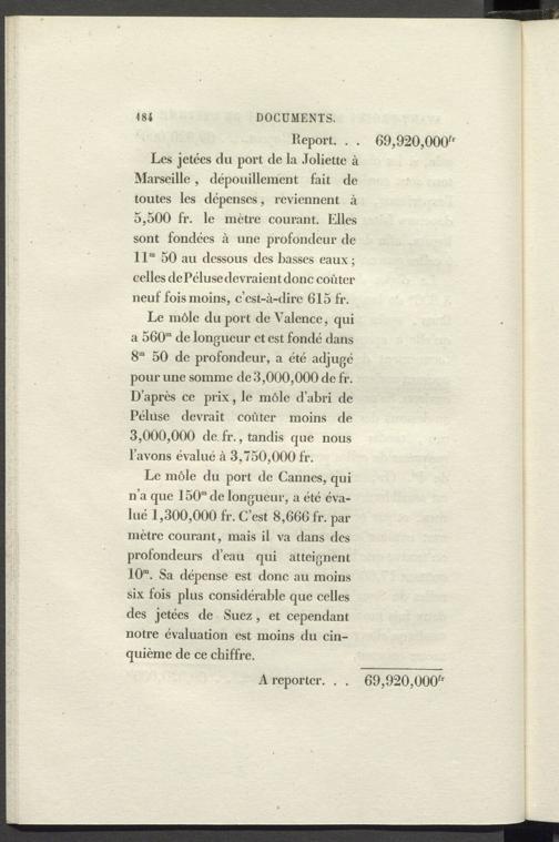 Le môle du port de Cannes, qui n’a que 150“ de longueur, a été évalué 1,300,000 fr. C’est 8,666 fr. par mètre courant, mais il va dans des profondeurs d’eau qui atteignent 10“. Sa dépense est donc au moins six fois plus considérable que celles des jetées de Suez , et cependant notre évaluation est moins du cinquième de ce chiffre.