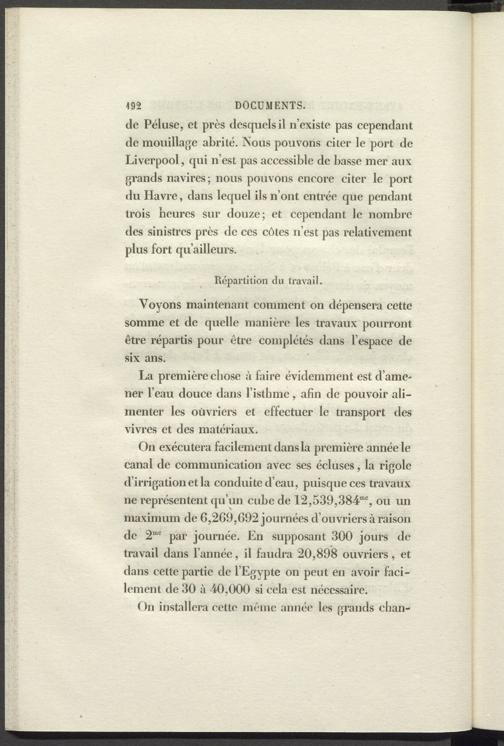On exécutera facilement dans la première année le canal de communication avec ses écluses, la rigole d’irrigation et la conduite d’eau, puisque ces travaux ne représentent qu’un cube de 12,539,384 mc , ou un maximum de 6,269,692 journées d’ouvriers à raison de 2 mc par journée. En supposant 300 jours de travail dans l’année, il faudra 20,898 ouvriers, et dans cette partie de l’Egypte on peut en avoir facilement de 30 à 40,000 si cela est nécessaire.