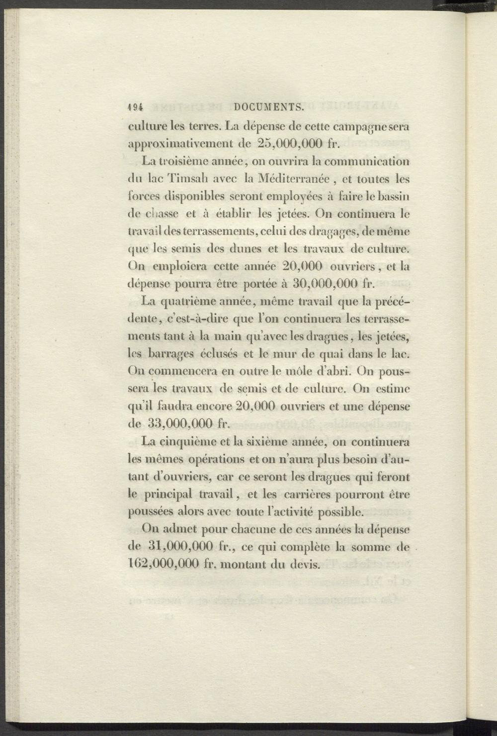 La troisième année, on ouvrira la communication du lac Timsah avec la Méditerranée , et toutes les forces disponibles seront employées à faire le bassin de chasse et à établir les jetées. On continuera le travail des terrassements, celui des dragages, de même cpie les semis des dunes et les travaux de culture. On emploiera cette année 20,000 ouvriers, et la dépense pourra être portée à 30,000,000 fr.