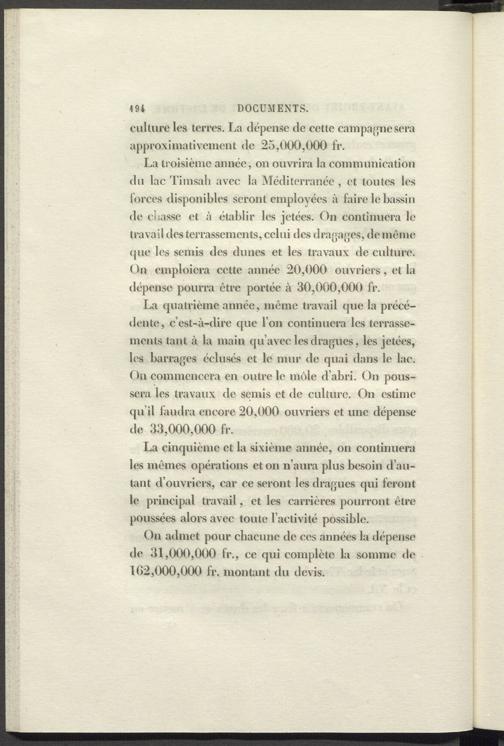 La quatrième année, même travail que la précédente, c’est-à-dire que l’on continuera les terrassements tant à la main qu’avec les dragues, les jetées, les barrages éclusés et le mur de quai dans le lac. On commencera en outre le môle d’abri. On poussera les travaux de semis et de culture. On estime qu’il faudra encore 20,000 ouvriers et une dépense de 33,000,000 fr.