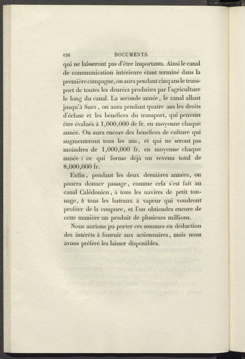 qui ne laisseront pas d’être importants. Ainsi le canal de communication intérieure étant terminé dans la première campagne, on aura pendant cinq ans le transport de toutes les denrées produites par l’agriculture le long du canal. La seconde année, le canal allant jusqu’à Suez , on aura pendant quatre ans les droits d’écluse et les bénéfices du transport, qui peuvent être évalués à 1,000,000 de fr. en moyenne chaque année. On aura encore des bénéfices de culture qui augmenteront tous les ans, et qui ne seront pas moindres de 1,000,000 fr. en moyenne chaque année : ce qui forme déjà un revenu total de 8,000,000 fr.