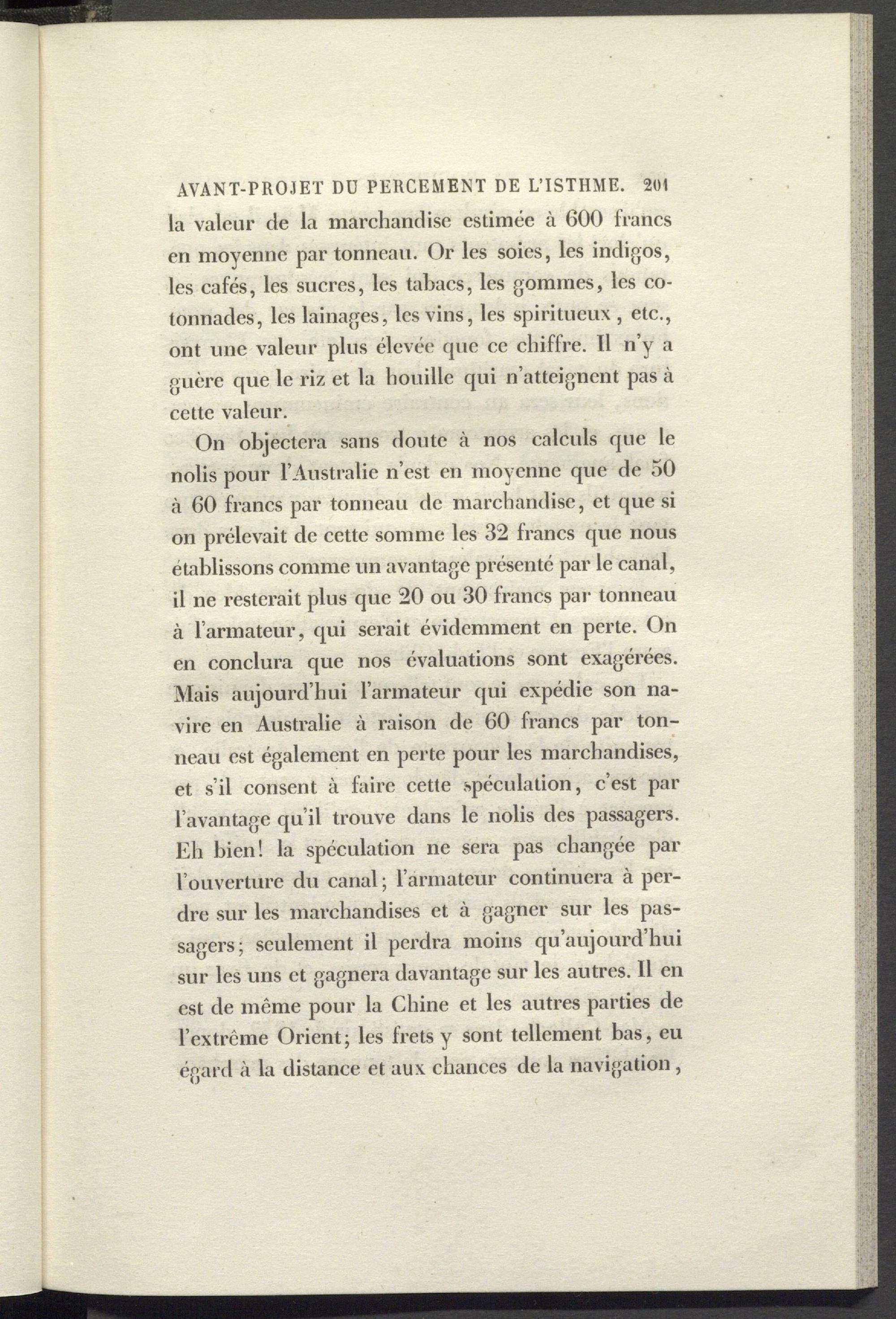 On objectera sans doute à nos calculs que le nolis pour l’Australie n’est en moyenne que de 50 à 60 francs par tonneau de marchandise, et que si on prélevait de cette somme les 32 francs que nous établissons comme un avantage présenté par le canal, il ne resterait plus que 20 ou 30 francs par tonneau à l’armateur, qui serait évidemment en perte. On en conclura que nos évaluations sont exagérées. Mais aujourd’hui l’armateur qui expédie son navire en Australie à raison de 60 francs par tonneau est également en perte pour les marchandises, et s’il consent à faire cette spéculation, c’est par l’avantage qu’il trouve dans le nolis des passagers. Eli bien! la spéculation ne sera pas changée par l’ouverture du canal ; l’armateur continuera à perdre sur les marchandises et à gagner sur les passagers; seulement il perdra moins qu’aujourd’hui sur les uns et gagnera davantage sur les autres. Il en est de même pour la Chine et les autres parties de l’extrême Orient; les frets y sont tellement bas, eu égard à la distance et aux chances de la navigation ,