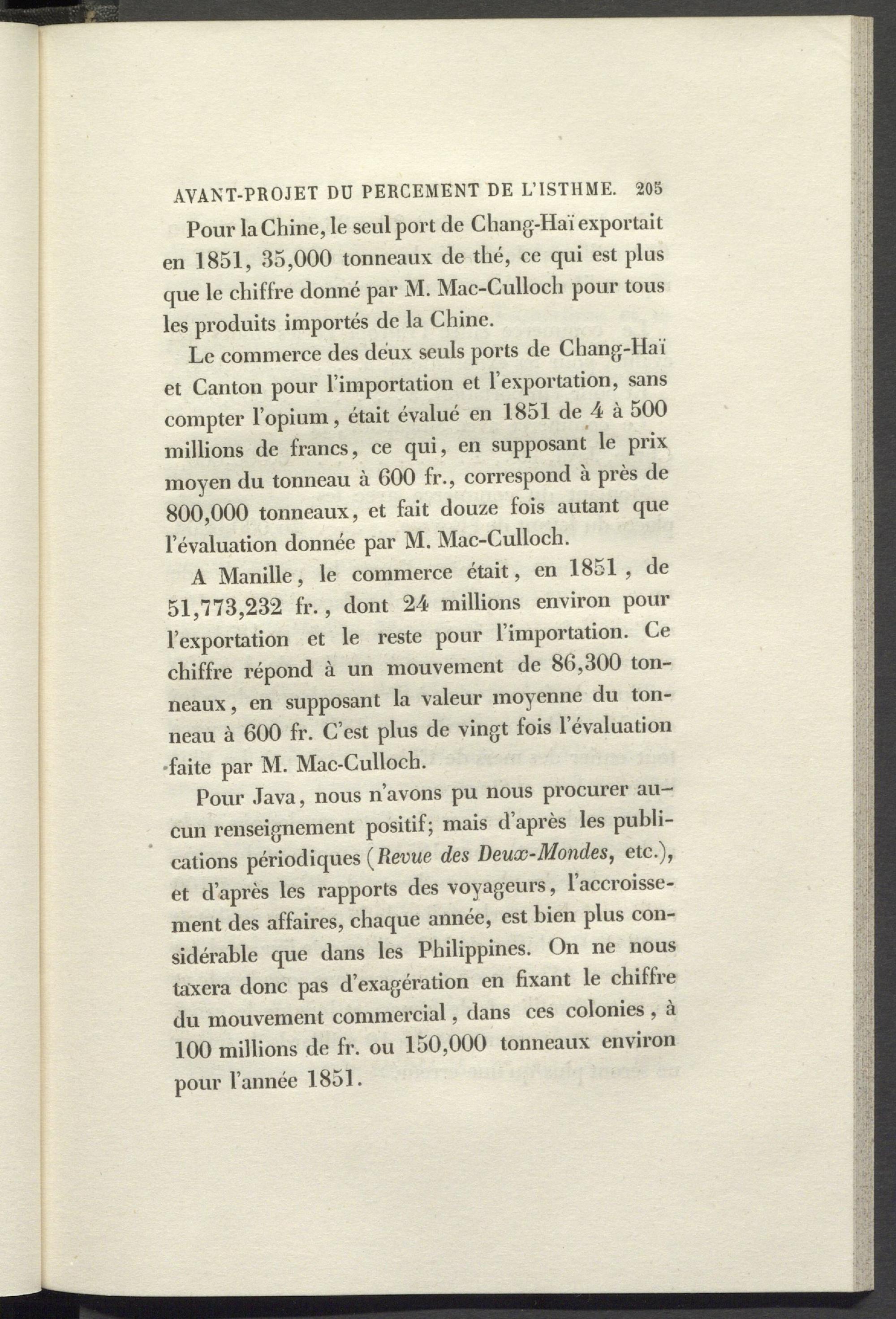 AVANT-PROJET DU PERCEMENT DE L’ISTHME. 205 Pour la Chine, le seul port de Chang-Hai exportait en 1851, 35,000 tonneaux de thé, ce qui est plus que le chiffre donné par M. Mac-Culloch pour tous les pi’oduits importés de la Chine.