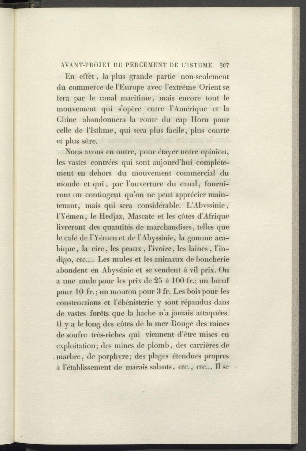Nous avons en outre, pour étayer notre opinion, les vastes contrées qui sont aujourd’hui complètement en dehors du mouvement commercial du monde et qui, par l’ouverture du canal, fourniront un contingent qu’on ne peut apprécier maintenant, mais qui sera considérable. L’Abyssinie, l’Yémen, le Hedjaz, Mascate et les côtes d’Afrique livreront des quantités de marchandises, telles que le café de l’Yémen et de l’Abyssinie, la gomme arabique, la cire, les peaux , l’ivoire, les laines, l’indigo, etc.... Les mules et les animaux de boucherie abondent en Abyssinie et se vendent à vil prix. On a une mule pour les prix de 25 à 100 fr.; un bœuf pour 10 fr. ; un mouton pour 3 fr. Les bois pour les constructions et l’ébénisterie y sont répandus dans de vastes forêts que la hache n’a jamais attaquées. Il y a le long des côtes de la mer bouge des mines de soufre très-riches qui viennent d’être mises en exploitation; des mines de plomb, des carrières de marbre, de porphyre; des plages étendues propres à l’établissement de marais salants, etc., etc... Il se
