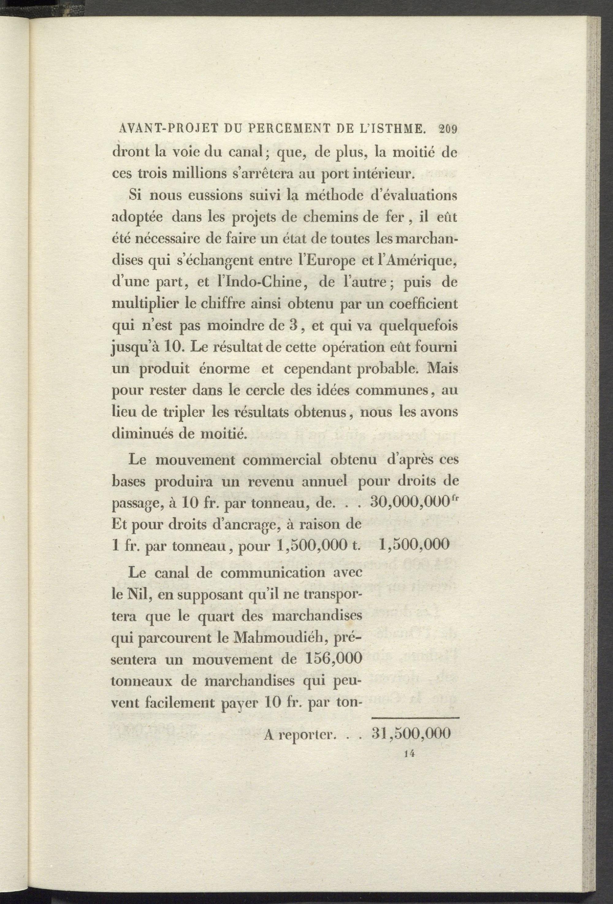 Si nous eussions suivi la méthode d’évaluations adoptée dans les projets de chemins de fer , il eût été nécessaire de faire un état de toutes les marchandises qui s’échangent entre l’Europe et l’Amérique, d’une part, et l’Indo-Chine, de l’autre; puis de multiplier le chiffre ainsi obtenu par un coefficient qui n’est pas moindre de 3, et qui va quelquefois jusqu’à 10. Le résultat de cette opération eût fourni un produit énorme et cependant probable. Mais pour rester dans le cercle des idées communes, au lieu de tripler les résultats obtenus, nous les avons diminués de moitié.