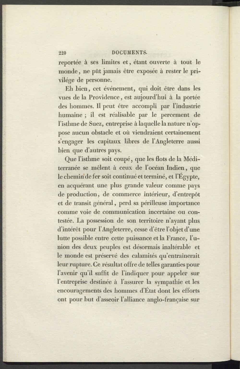 Eh bien, cet événement, qui doit être dans les vues de la Providence, est aujourd’hui à la portée des hommes. Il peut être accompli par l’industrie humaine ; il est l’éalisable par le percement de l’isthme de Suez, entreprise à laquelle la nature n’oppose aucun obstacle et où viendraient certainement s’engager les capitaux libres de l’Angleterre aussi bien que d’autres pays.