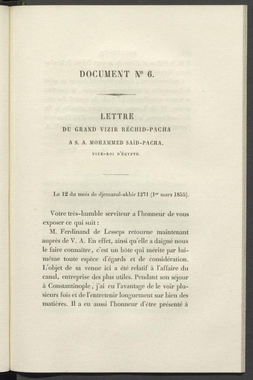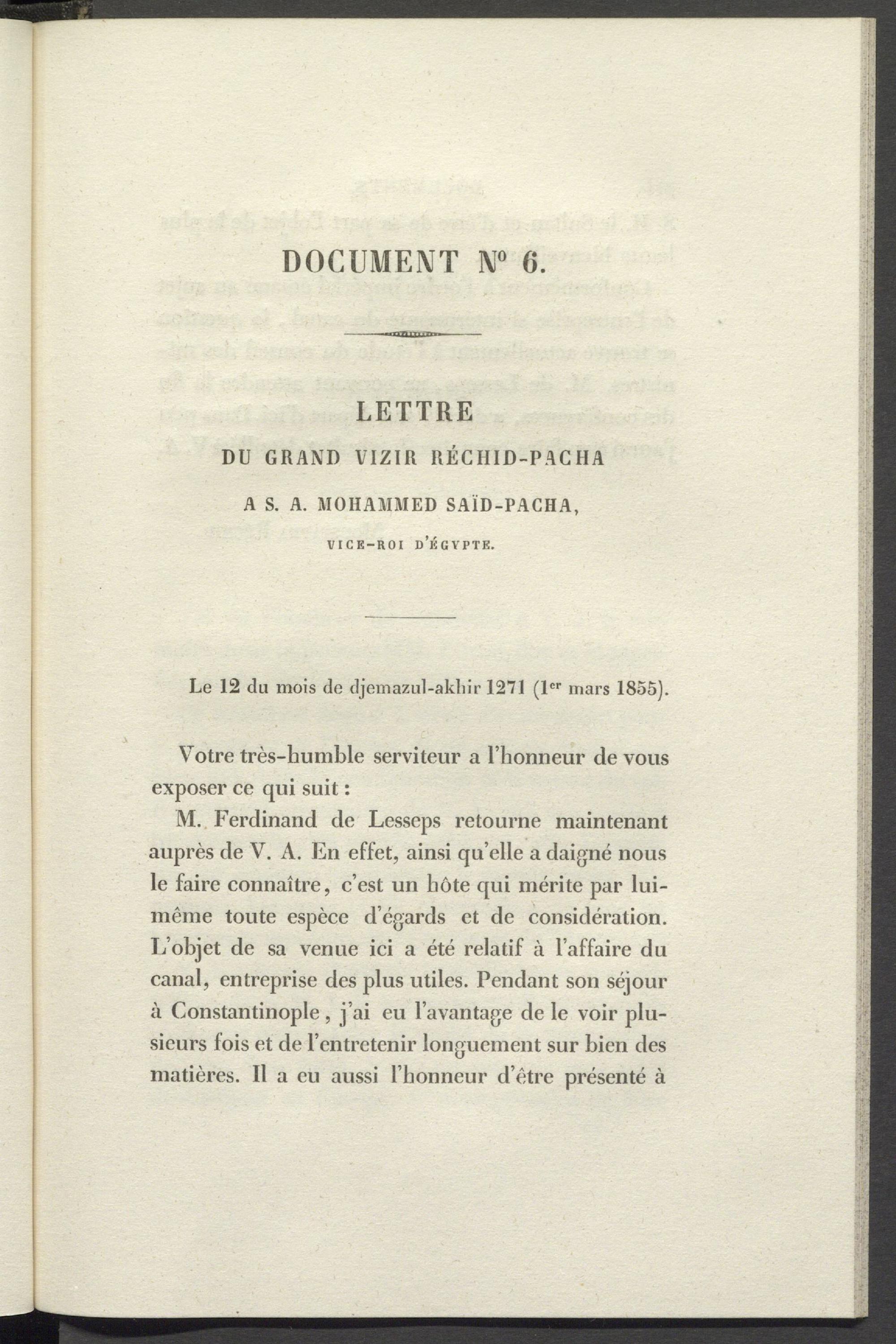M. Ferdinand de Lesseps retourne maintenant auprès de V. A. En effet, ainsi qu’elle a daigné nous le faire connaître, c’est un hôte qui mérite par lui- même toute espèce d’égards et de considération. L’objet de sa venue ici a été relatif à l’affaire du canal, entreprise des plus utiles. Pendant son séjour à Constantinople , j’ai eu l’avantage de le voir plusieurs fois et de l’entretenir longuement sur bien des matières. Il a eu aussi l’honneur d’être présenté à
