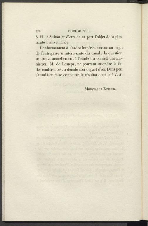 Conformément à l’ordre impérial émané au sujet de l’entreprise si intéressante du canal, la question se trouve actuellement à l’étude du conseil des ministres. M. de Lesseps, ne pouvant attendre la fin des conférences, a décidé son départ d’ici. Dans peu j’aurai à en faire connaître le résultat détaillé à Y. A.