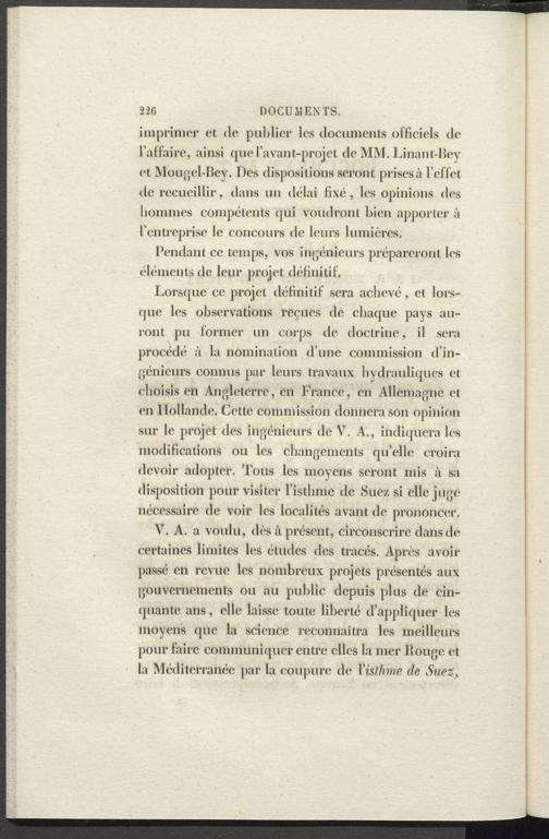 imprimer et île publier les documents officiels de l’affaire, ainsi quel’avant-projet de MM. Linant-liey et Mougel-Bey. Des dispositions seront prises à l’effet de recueillir, dans un délai fixé, les opinions des hommes compétents qui voudront bien apporter à l’entreprise le concours de leurs lumières.
