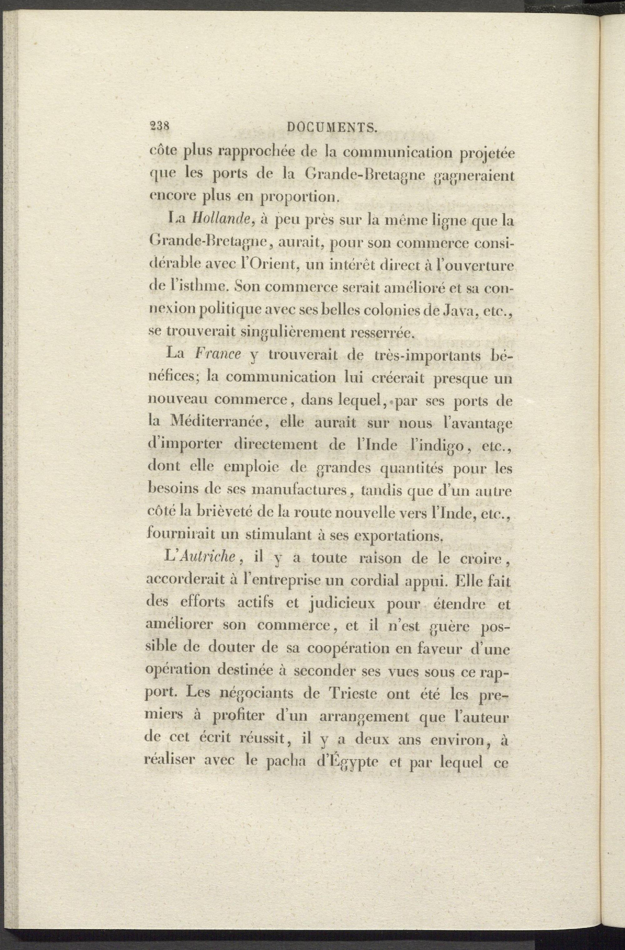 F'Autriche , il y a toute raison de le croire, accorderait à l’entreprise un cordial appui. Elle fait des efforts actifs et judicieux pour étendre et améliorer son commerce, et il n’est guère possible de douter de sa coopération en faveur d’une opération destinée à seconder ses vues sous ce rapport. Les négociants de Trieste ont été les premiers à profiter d’un arrangement que l’auteur de cet écrit réussit, il y a deux ans environ, à réaliser avec le pacha d’Egypte et par lequel ce