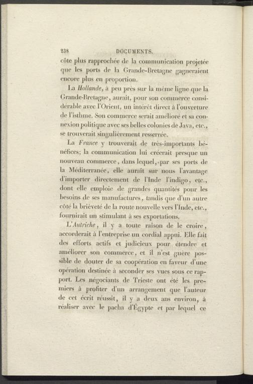 La France y trouverait de très-importants bénéfices; la communication lui créerait presque un nouveau commerce, dans lequel,«par ses ports de la Méditerranée, elle aurait sur nous l’avantage d’importer directement de l’Inde l’indigo, etc., dont elle emploie de grandes quantités pour les besoins de ses manufactures, tandis que d’un autre côté la brièveté de la route nouvelle vers l’Inde, etc., fournirait un stimulant uses exportations.