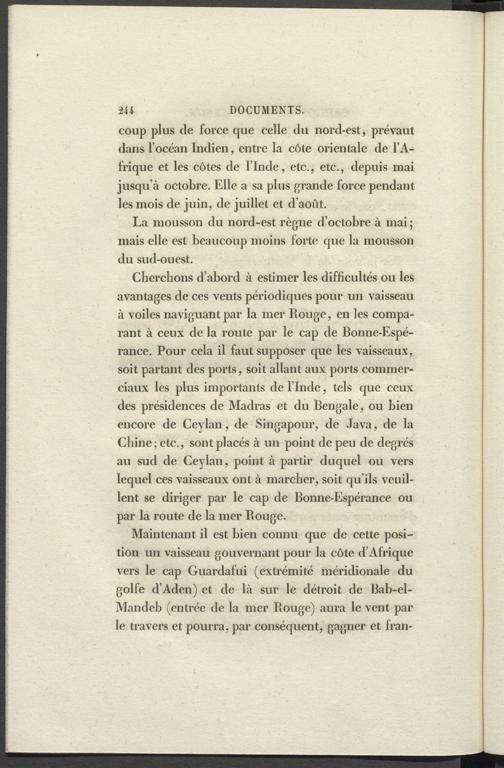 Maintenant il est bien connu que de cette position un vaisseau gouvernant pour la côte d’Afrique vers le cap Guardafui (extrémité méridionale du golfe d’Aden) et de là sur le détroit de Bab-el- Mandeb (entrée de la mer Rouge) aura le vent par le travers et pourra, par conséquent, gagner et fran-