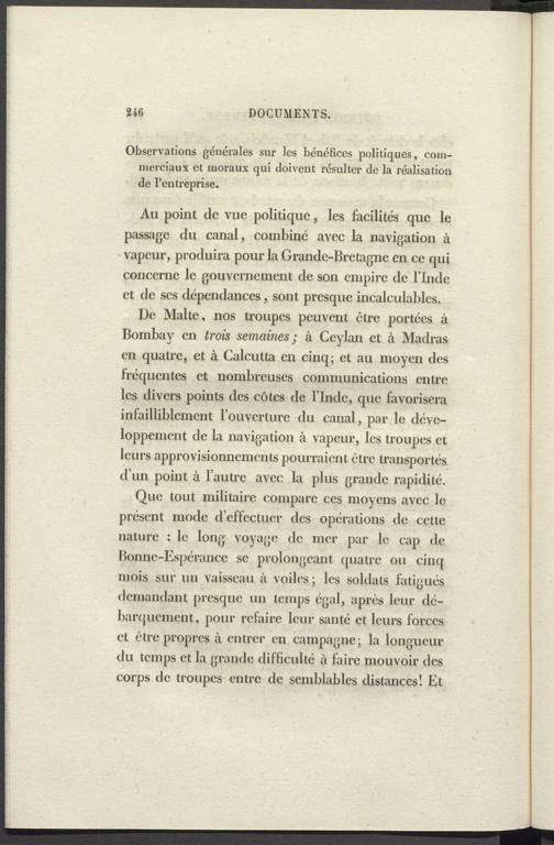 Au point de vue politique, les facilités que le passage du canal, combiné avec la navigation à vapeur, produira pour la Grande-Bretagne en ce qui concerne le gouvernement de son empire de l’Inde et de ses dépendances, sont presque incalculables.