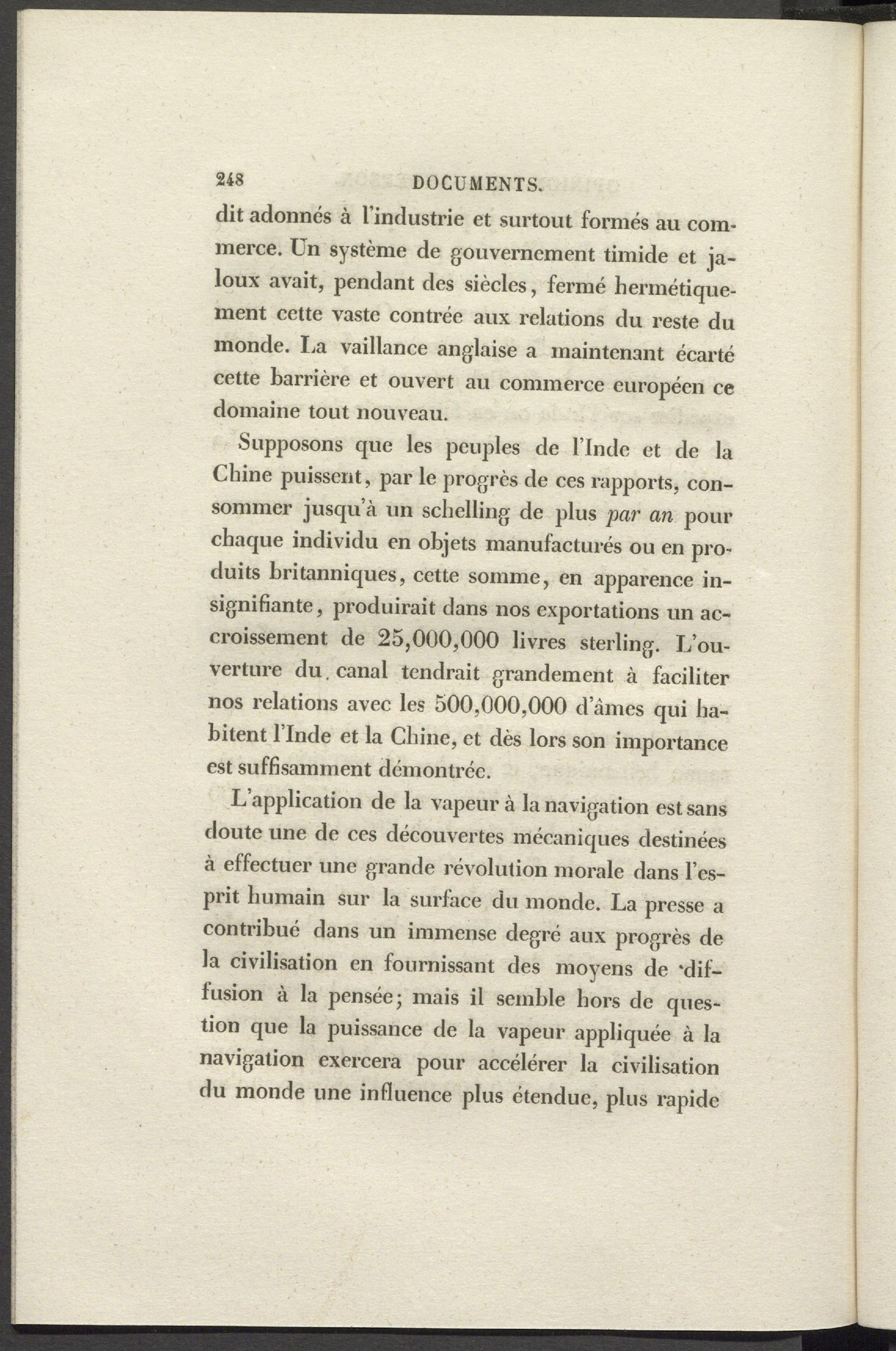 Supposons que les peuples de l’Inde et de la Chine puissent, par le progrès de ces rapports, consommer jusqu’à un schelling de plus par an pour chaque individu en objets manufacturés ou en produits britanniques, cette somme, en apparence insignifiante , produirait dans nos exportations un accroissement de 25,000,000 livres sterling. L’ouverture du. canal tendrait grandement à faciliter nos relations avec les 500,000,000 d’âmes qui habitent l’Inde et la Chine, et dès lors son importance est suffisamment démontrée.