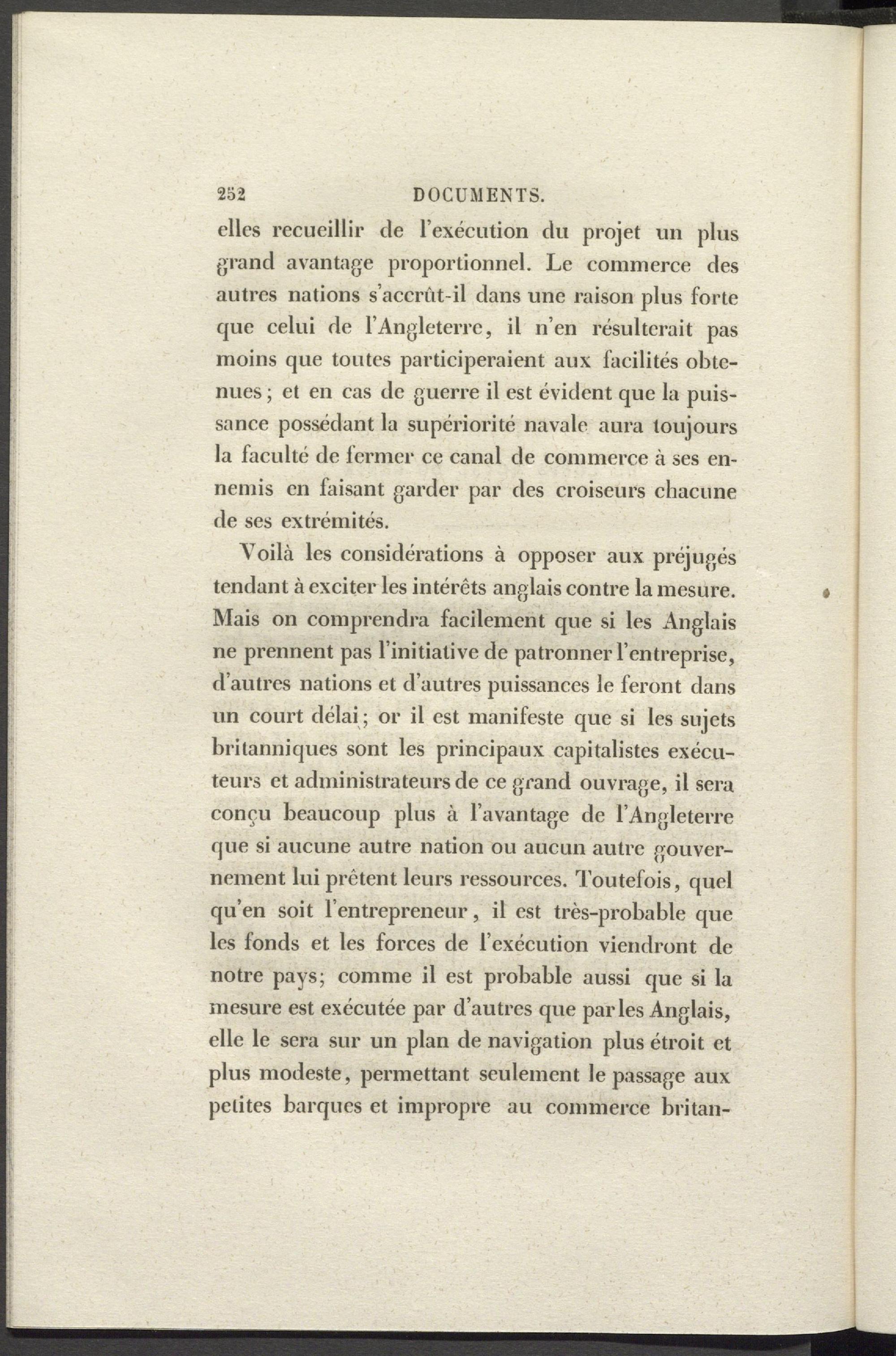 Voilà les considérations à opposer aux préjugés tendant à exciter les intérêts anglais contre la mesure. Mais on comprendra facilement que si les Anglais ne prennent pas l’initiative de patronner l’entreprise, d’autres nations et d’autres puissances le feront dans un court délai ; or il est manifeste que si les sujets britanniques sont les principaux capitalistes exécuteurs et administrateurs de ce grand ouvrage, il sera conçu beaucoup plus à l’avantage de l'Angleterre que si aucune autre nation ou aucun autre gouvernement lui prêtent leurs ressources. Toutefois, quel qu’en soit l’entrepreneur, il est très-probable que les fonds et les forces de l’exécution viendront de notre pays; comme il est probable aussi que si la mesure est exécutée par d’autres que parles Anglais, elle le sera sur un jxlan de navigation plus étroit et plus modeste, permettant seulement le passage aux petites barques et impropre au commerce britan-