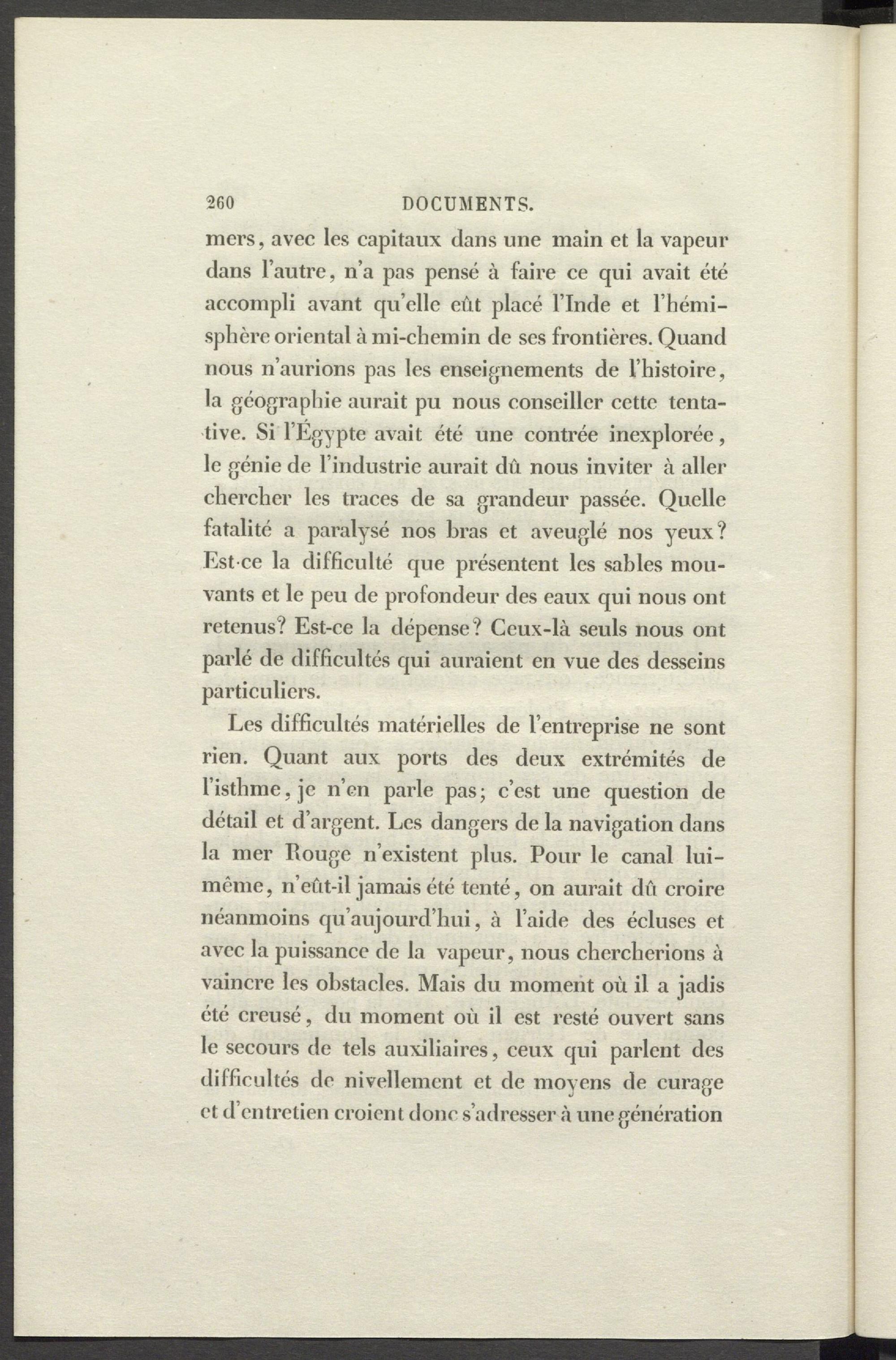 mers, avec les capitaux dans une main et la vapeur dans l’autre, n’a pas pensé à faire ce qui avait été accompli avant qu’elle eût placé l’Inde et l’hémisphère oriental à mi-chemin de ses frontières. Quand nous n’aurions pas les enseignements de l’histoire, la géographie aurait pu nous conseiller cette tentative. Si l’Egypte avait été une contrée inexplorée, le génie de l’industrie aurait dû nous inviter à aller chercher les traces de sa grandeur passée. Quelle fatalité a paralysé nos bras et aveuglé nos yeux? Est ce la difficulté que présentent les sables mouvants et le peu de profondeur des eaux qui nous ont retenus? Est-ce la dépense ? Ceux-là seuls nous ont parlé de difficultés qui auraient en vue des desseins particuliers.