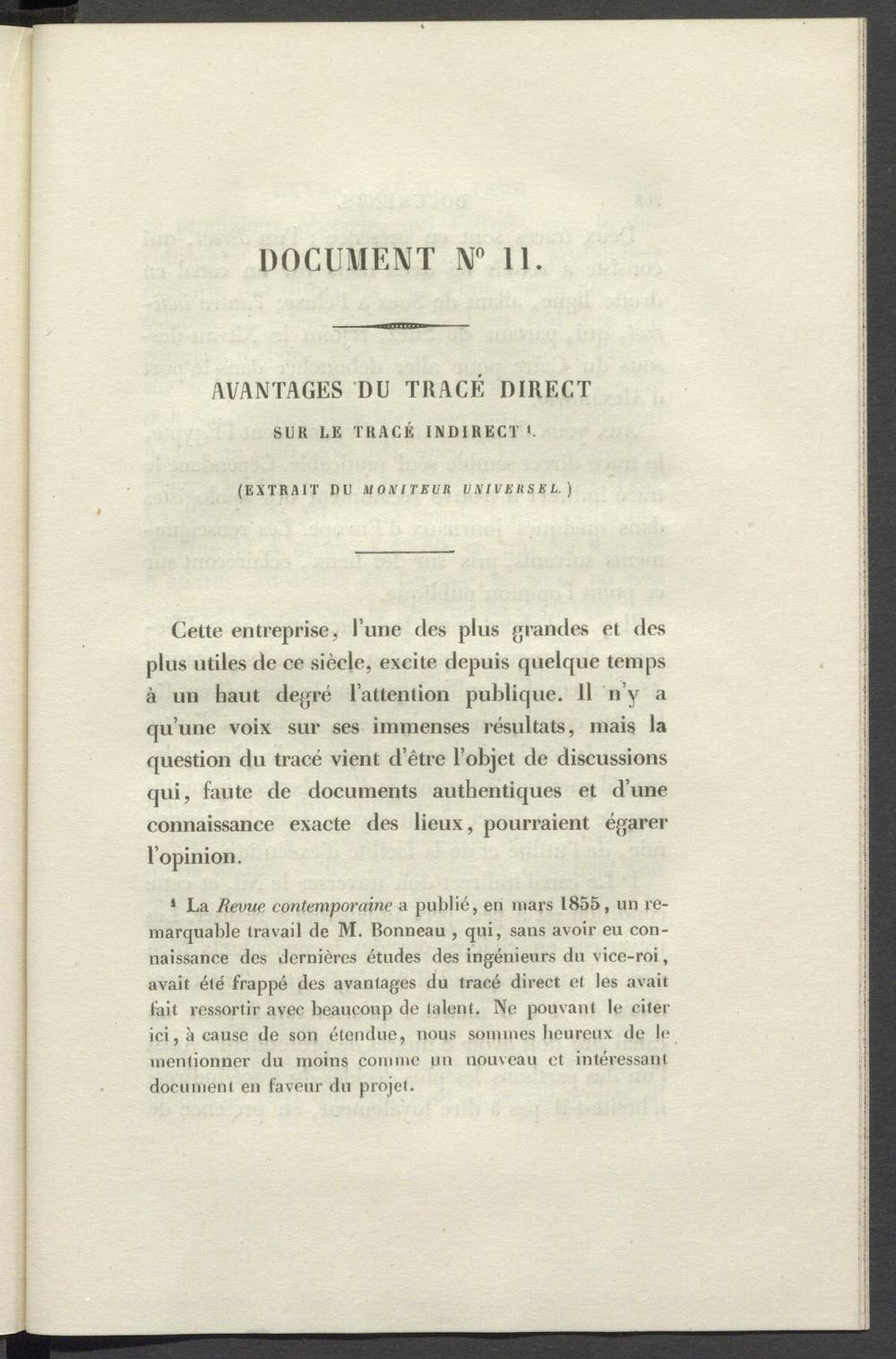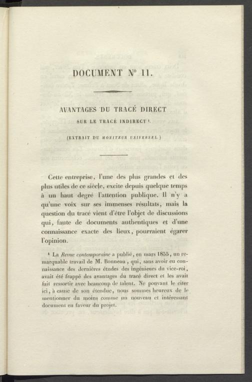 1 La Revue contemporaine a publié, en mars 1855, un remarquable travail de M. Bonneau , qui, sans avoir eu connaissance des dernières études des ingénieurs du vice-roi, avait été frappé des avantages du tracé direct et les avait lait ressortir avec beaucoup de talent. Ne pouvant le citer ici, à cause de son étendue, nous sommes heureux de le mentionner du moins comme un nouveau et intéressant document en faveur du projet.