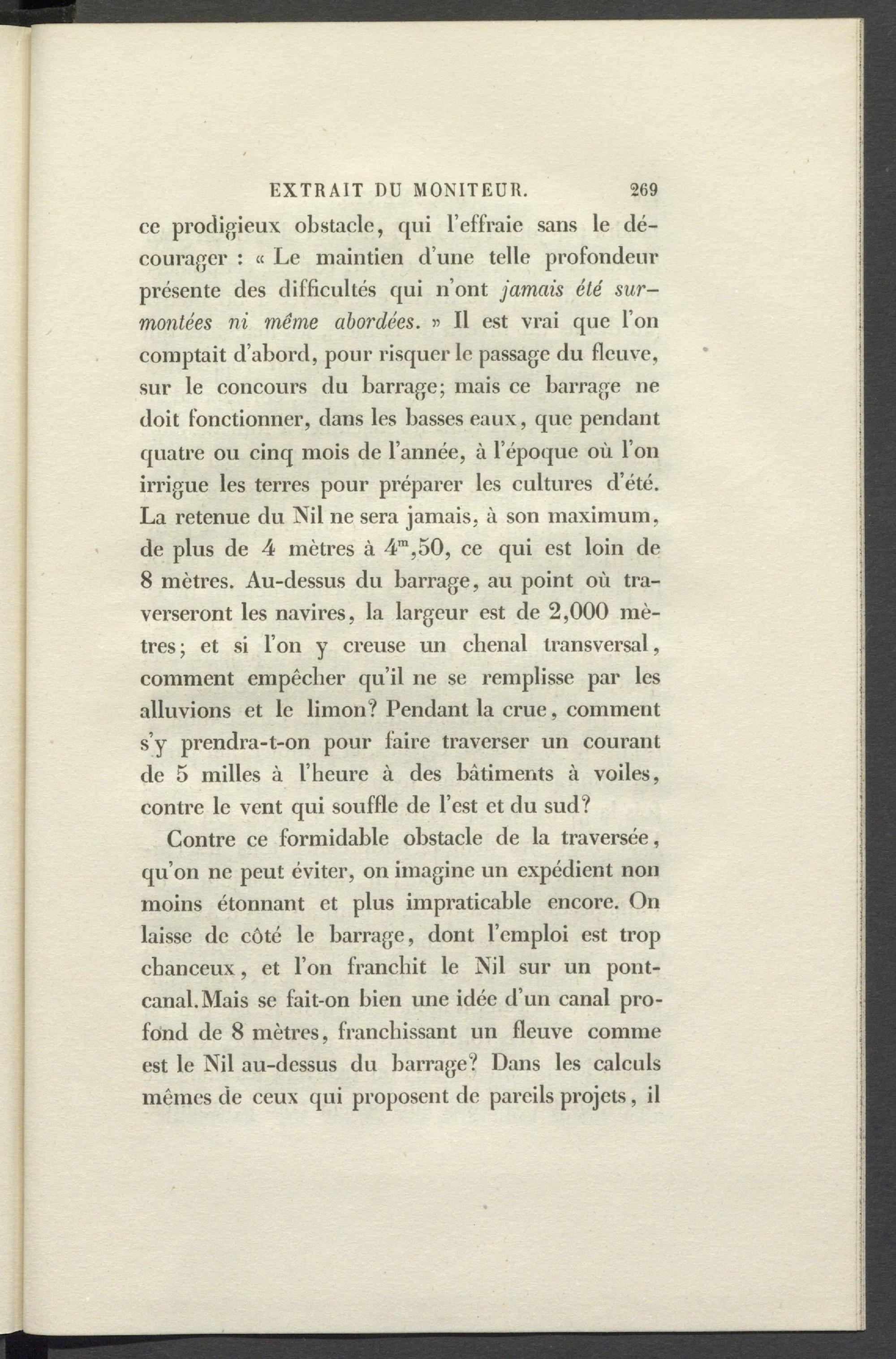 Contre ce formidable obstacle de la traversée, qu’on ne peut éviter, on imagine un expédient non moins étonnant et plus impraticable encore. On laisse de côté le barrage, dont l’emploi est trop chanceux, et l’on franchit le Nil sur un pont- canal. Mais se fait-on bien une idée d’un canal profond de 8 mètres, franchissant un fleuve comme est le Nil au-dessus du barrage? Dans les calculs mômes de ceux qui proposent de pareils projets, il