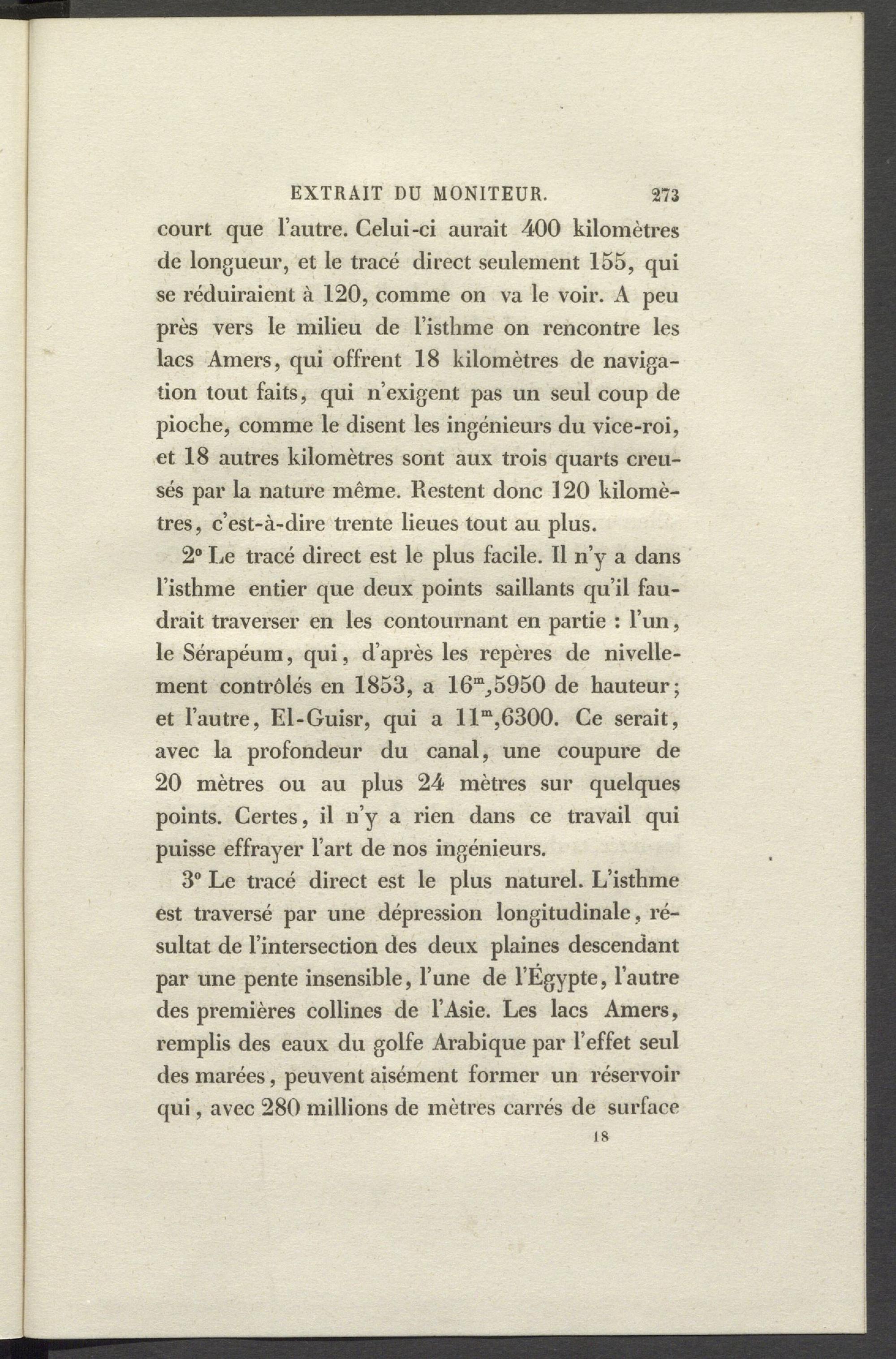 2° I^e tracé direct est le plus facile. Il n’y a dans l’isthme entier que deux points saillants qu’il faudrait traverser en les contournant en partie : l’un, le Sérapéum, qui, d’après les repères de nivellement contrôlés en 1853, a 16 m ,5950 de hauteur; et l’autre, El-Guisr, qui a ll m ,6300. Ce serait, avec la profondeur du canal, une coupure de 20 mètres ou au plus 24 mètres sur quelques points. Certes, il n’y a rien dans ce travail qui puisse effrayer l’art de nos ingénieurs.