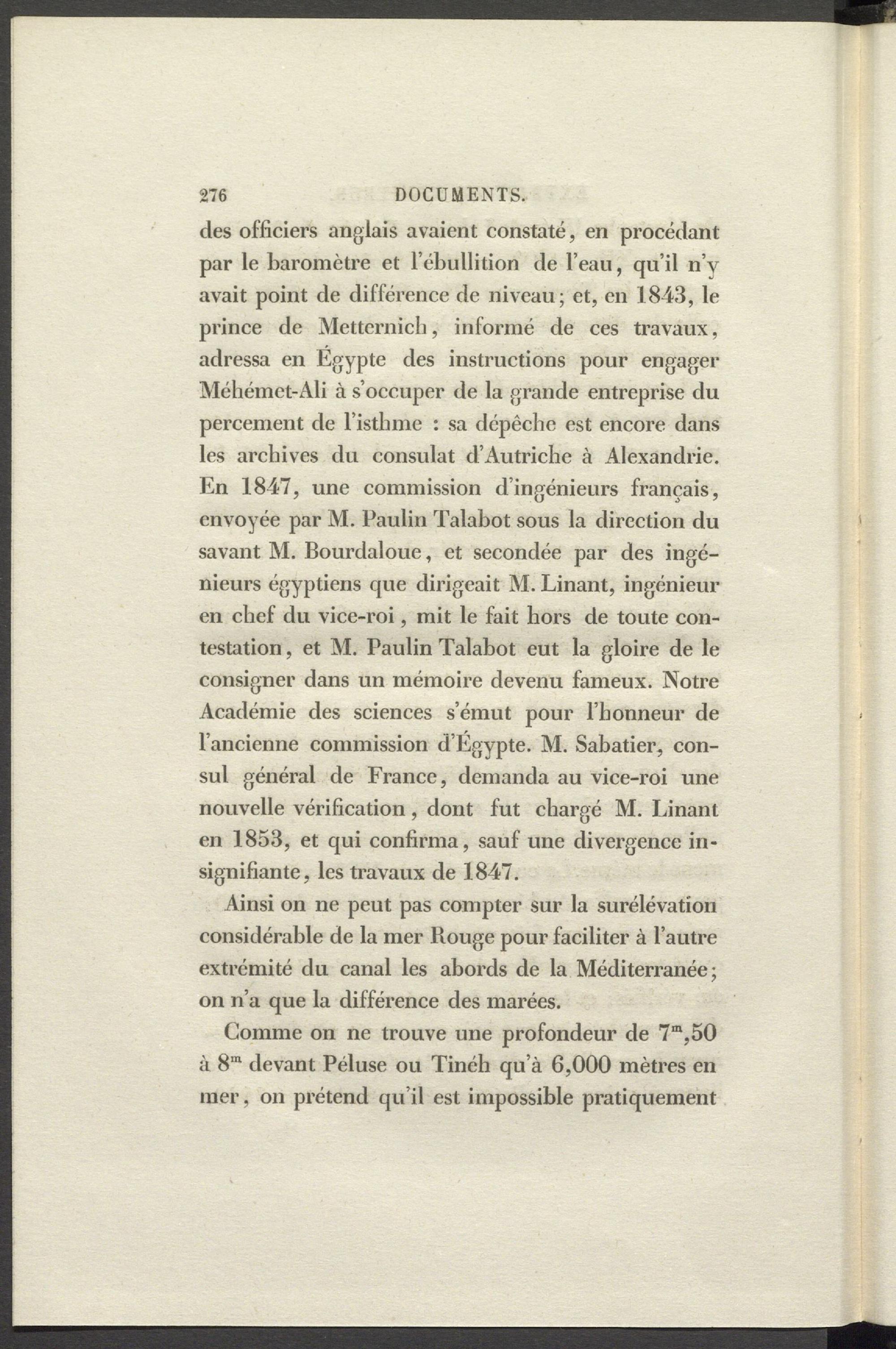 des officiers anglais avaient constaté, en procédant par le baromètre et l’ébullition de l’eau, qu’il n’v avait point de différence de niveau; et, en 1843, le prince de Mettcrnich, informé de ces travaux, adressa en Egypte des instructions pour engager Méhémet-Ali à s’occuper de la grande entreprise du percement de l’isthme : sa dépêche est encore dans les archives du consulat d’Autriche à Alexandrie. En 1847, une commission d’ingénieurs français, envoyée par M. Paulin Talabot sous la direction du savant M. Bourdaloue, et secondée par des ingénieurs égyptiens que dirigeait M. Linant, ingénieur en chef du vice-roi, mit le fait hors de toute contestation , et M. Paulin Talabot eut la gloire de le consigner dans un mémoire devenu fameux. Notre Académie des sciences s’émut pour l’honneur de l’ancienne commission d’Egypte. M. Sabatier, consul général de France, demanda au vice-roi une nouvelle vérification, dont fut chargé M. Linant en 1853, et qui confirma, sauf une divergence insignifiante, les travaux de 1847.