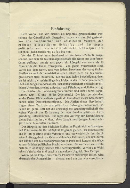 Der Ehrgeiz, zu den höchsten Stellen in Frankreich aufzusteigen, ließ Poincaré in die Botmäßigkeit Englands gleiten. Er mißbrauchte das in ihn gesetzte große Vertrauen und verwertete die ihm durch seine Auftraggeberin zu Gebote stehenden Urkunden, um sich durch den Einfluß der Suezkanalgewaltigen in Paris und London die Wege zu persönlicher politischer Macht zu ebnen. So wurde er von Großbritannien abhängig, verriet seine Auftraggeberin, verriet das Wohl seines Vaterlandes und brachte namenloses Unglück über Europa.