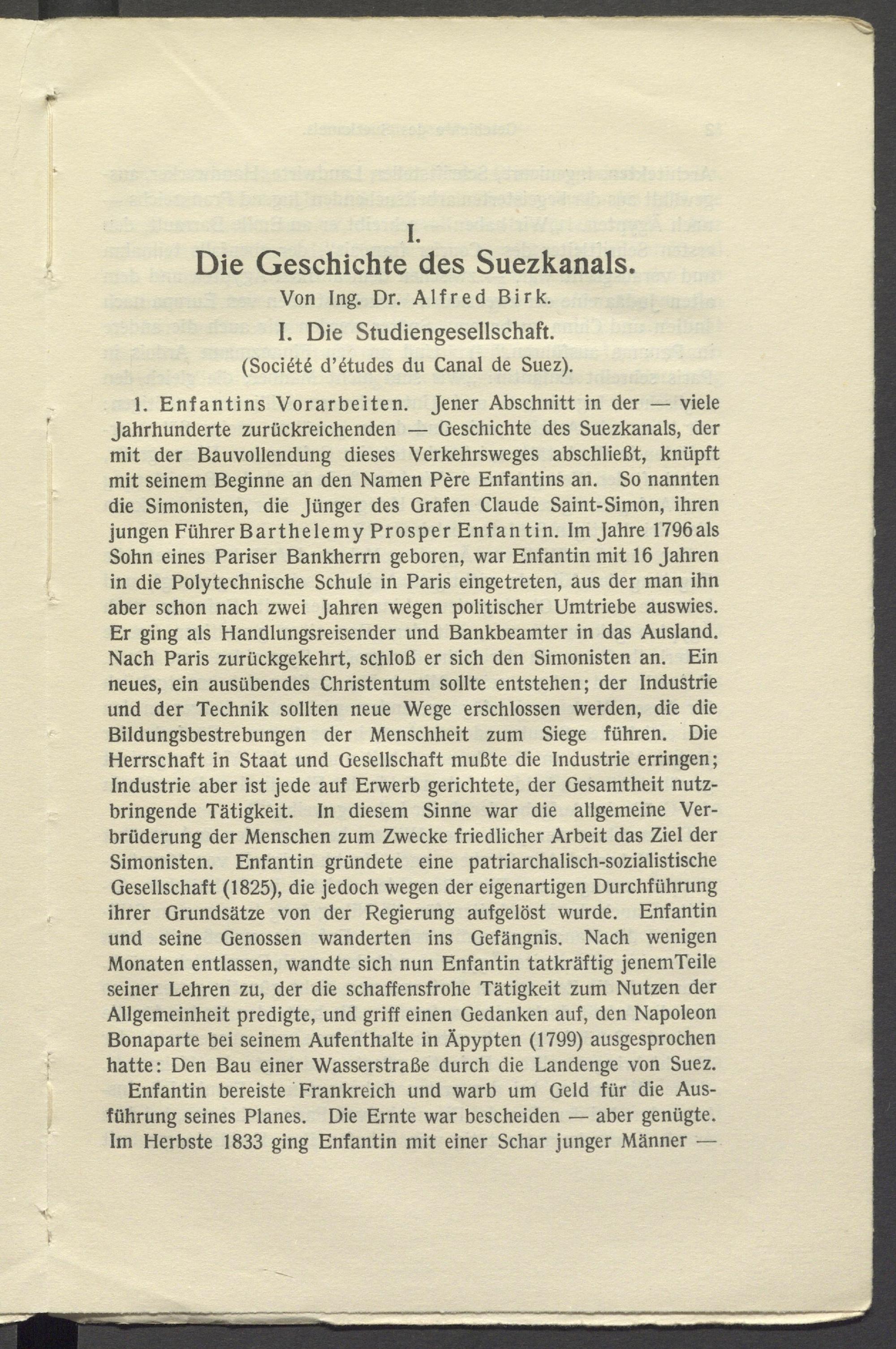 1. Enfantins Vorarbeiten. Jener Abschnitt in der — viele Jahrhunderte zurückreichenden — Geschichte des Suezkanals, der mit der Bauvollendung dieses Verkehrsweges abschließt, knüpft mit seinem Beginne an den Namen Père Enfantins an. So nannten die Simonisten, die Jünger des Grafen Claude Saint-Simon, ihren jungen Führer Barthélémy Prosper Enf an tin. Im Jahre 1796als Sohn eines Pariser Bankherrn geboren, war Enfantin mit 16 Jahren in die Polytechnische Schule in Paris eingetreten, aus der man ihn aber schon nach zwei Jahren wegen politischer Umtriebe auswies. Er ging als Handlungsreisender und Bankbeamter in das Ausland. Nach Paris zurückgekehrt, schloß er sich den Simonisten an. Ein neues, ein ausübendes Christentum sollte entstehen; der Industrie und der Technik sollten neue Wege erschlossen werden, die die Bildungsbestrebungen der Menschheit zum Siege führen. Die Herrschaft in Staat und Gesellschaft mußte die Industrie erringen; Industrie aber ist jede auf Erwerb gerichtete, der Gesamtheit nutzbringende Tätigkeit. In diesem Sinne war die allgemeine Verbrüderung der Menschen zum Zwecke friedlicher Arbeit das Ziel der Simonisten. Enfantin gründete eine patriarchalisch-sozialistische Gesellschaft (1825), die jedoch wegen der eigenartigen Durchführung ihrer Grundsätze von der Regierung aufgelöst wurde. Enfantin und seine Genossen wanderten ins Gefängnis. Nach wenigen Monaten entlassen, wandte sich nun Enfantin tatkräftig jenemTeile seiner Lehren zu, der die schaffensfrohe Tätigkeit zum Nutzen der Allgemeinheit predigte, und griff einen Gedanken auf, den Napoleon Bonaparte bei seinem Aufenthalte in Äpypten (1799) ausgesprochen hatte: Den Bau einer Wasserstraße durch die Landenge von Suez.