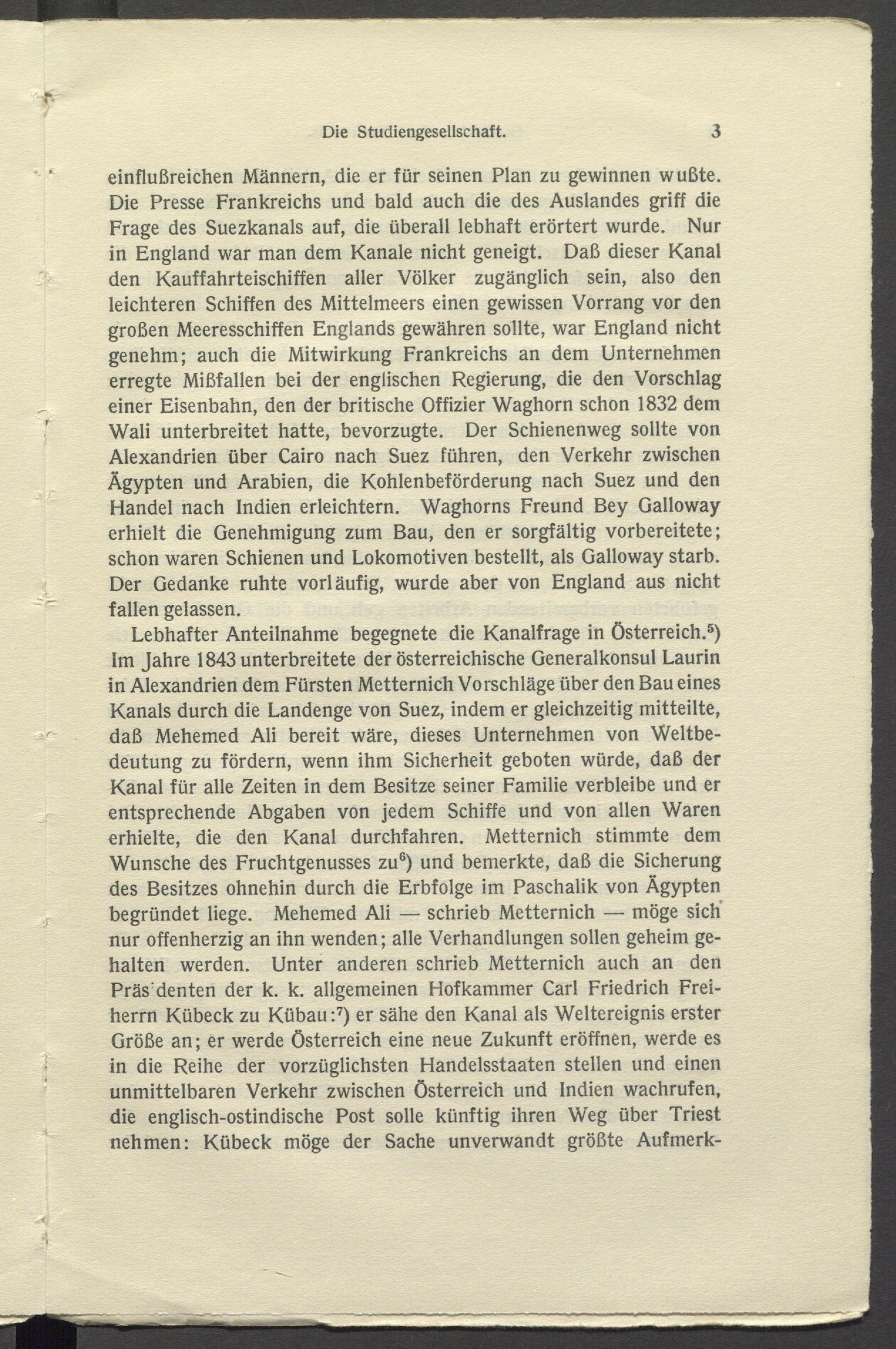 Lebhafter Anteilnahme begegnete die Kanalfrage in Österreich. 5 ) Im Jahre 1843 unterbreitete der österreichische Generalkonsul Laurin in Alexandrien dem Fürsten Metternich Vorschläge über den Baueines Kanals durch die Landenge von Suez, indem er gleichzeitig mitteilte, daß Mehemed Ali bereit wäre, dieses Unternehmen von Weltbedeutung zu fördern, wenn ihm Sicherheit geboten würde, daß der Kanal für alle Zeiten in dem Besitze seiner Familie verbleibe und er entsprechende Abgaben von jedem Schiffe und von allen Waren erhielte, die den Kanal durchfahren. Metternich stimmte dem Wunsche des Fruchtgenusses zu 6 ) und bemerkte, daß die Sicherung des Besitzes ohnehin durch die Erbfolge im Paschalik von Ägypten begründet liege. Mehemed Ali — schrieb Metternich — möge sich nur offenherzig an ihn wenden; alle Verhandlungen sollen geheim gehalten werden. Unter anderen schrieb Metternich auch an den Präs denten der k. k. allgemeinen Hofkammer Carl Friedrich Freiherrn Kübeck zu Kübau: 7 ) er sähe den Kanal als Weltereignis erster Größe an; er werde Österreich eine neue Zukunft eröffnen, werde es in die Reihe der vorzüglichsten Handelsstaaten stellen und einen unmittelbaren Verkehr zwischen Österreich und Indien wachrufen, die englisch-ostindische Post solle künftig ihren Weg über Triest nehmen: Kübeck möge der Sache unverwandt größte Aufmerk-
